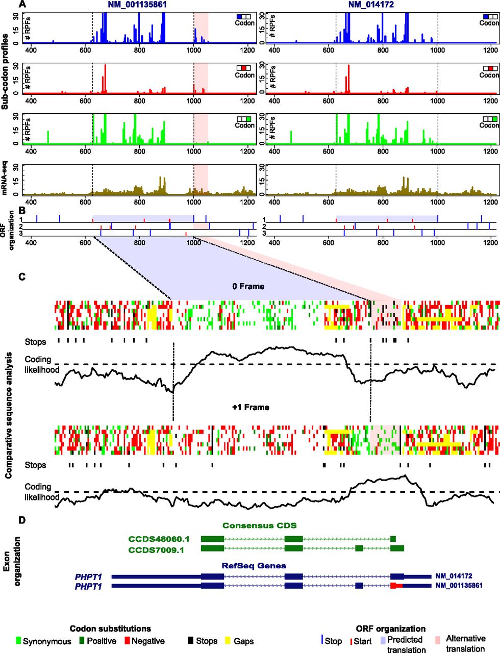 Dual coding in alternatively spliced PHPT1 exon. (A) Subcodon profile and mRNA-seq for PHPT1 mRNA variant NM_001135861 (left) and variant NM_014172 (right). (B) ORF organization for NM_001135861 (left) and NM_014172 (right). (C) Analysis of codon substitutions within the multiple alignments of orthologous genomic sequences for NM_001135861. (D) Exon organization of the two PHPT1 mRNA variants. For notations, see legend to Figure 4. Subcodon profiles for variant NM_001135861 (panel A, left), which is the longest isoform (see Methods), indicate that while the translated frame is the same as the CDS for most of the CDS region (low RPFs density for the second [red] position), the sequence is translated in the +1 frame relative to the CDS frame at its end and downstream (pink shaded area). In addition, there is an evident gap in translation in the subcodon profile and mRNA-seq just prior to the pink shaded area, which corresponds to the third exon in PHPT1 mRNA variant NM_001135861 (panel D). As a result, the fourth exon in the NM_001135861 mRNA is in an alternative frame relative to the CDS start codon. Codon substitution analysis of multiple sequence alignments (panel C) is consistent with the dual decoding of the 5′ end of the fourth exon. Synonymous and positive nonsynonymous substitutions are predominant in both the zero and +1 frames in the locations where RPFs are found.