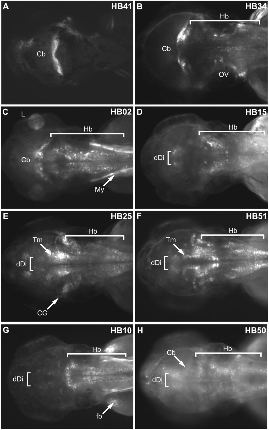 Predicted enhancers display pleiotropic expression patterns in the hindbrain. (A–H) GFP reporter expression from eight stable lines corresponding to Hb predictions showing expression across the Hb as well as in some non-Hb domains. Dorsal view images were taken at 3 dpf (for lateral images, see Supplemental Figures), anterior to the left. (A) HB41, (B) HB34, (C) HB02, (D) HB15, (E) HB25, (F) HB51, (G) Hb10, (H) HB50. (Cb) cerebellum; (OV) otic vesicle; (Hb) hindbrain; (L) lens; (My) myotome; (dDi) dorsal diencephalon; (Tm) tegmentum; (CG) cranial ganglia; (fb) fin bud.