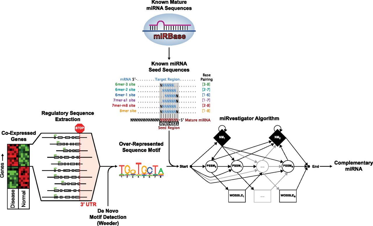 Overview of Weeder–miRvestigator tandem that we developed to identify miRNAs driving coexpression of transcripts. Quantitative assays of the transcriptome are used to identify gene-coexpression signatures comprised of genes with significantly similar gene-expression profiles. The 3′ UTR sequences for the coexpressed genes are then extracted from the genome and used as input into the Weeder algorithm. The Weeder algorithm searches the 3′ UTR sequences for an overrepresented motif, which is turned into a miRvestigator hidden Markov model (HMM). All of the miRNA seed sequences from the miRNA repository miRBase are compared with the HMM model of the overrepresented sequence motif using the Viterbi algorithm. The miRNA seed sequence with the most significant complementarity P-value is the most likely miRNA driving the coexpression signature and a hypothesis that can be tested experimentally.