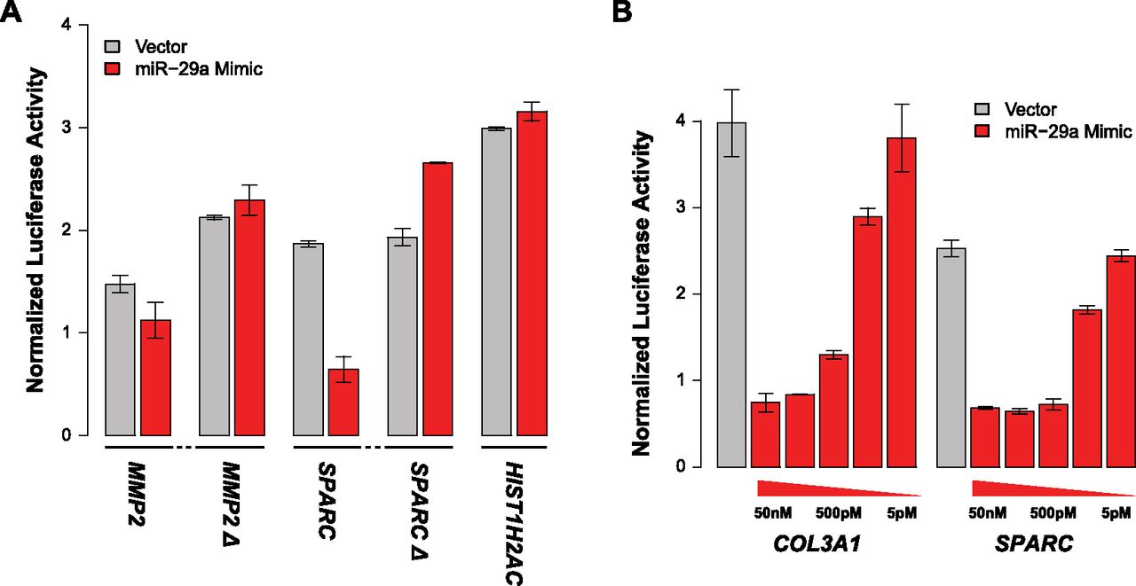 Luciferase reporter assay validation of miRNA-binding site predictions from FIRM. (A) Deletion of miR-29-binding sites ablates response to miR-29a mimic. The wild-type 3′ UTRs are MMP2 and SPARC. The miR-29-binding sites that deleted 3′ UTRs are MMP2 Δ and SPARC Δ. The deletions have a slight increase in normalized luminescence over their corresponding vector control, which is similar to what is observed for the negative control, HIST1H2AC, which does not have a miR-29-binding site. (B) Dose response curves for COL3A1 and SPARC titrating the amounts of miR-29a mimic (50 nM, 5 nM, 500 pM, 50 pM, and 5 pM).