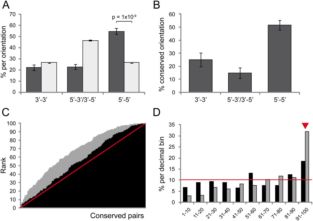 Predictive features of coregulated gene pairs. (A) Percentage of gene pairs oriented in 3′–3′ (convergently transcribed), 5′–3′ or 3′–5′ (codirectionally transcribed), or 5′–5′ (divergently transcribed) among human conserved gene pairs (dark gray) and control set (all nonconserved, nonparalogous gene pairs; light gray). Conserved pairs are highly enriched in 5′–5′ orientation (P = 1 × 10−9, χ2 test). (B) Percentage of pairs with fully conserved orientation across species for human conserved gene pairs; 5′–5′ pairs are more conserved. (C) Cumulative plot of ranks of ranked correlation coefficients of conserved pairs among the control data set (nonconserved neighbor pairs with the same orientation and similar intergenic distance; black) and random gene pairs (gray). The red line shows the expected cumulative pattern if coexpression was similar to the controls, and the area above the line the excess of highly coexpressed pairs. (D) Percentage of conserved pairs with ranks in each of the decimal bins. The red line (10%) indicates the expected values. Conserved pairs were significantly enriched in ranks of the last decimal bin (91–100, red arrowhead).