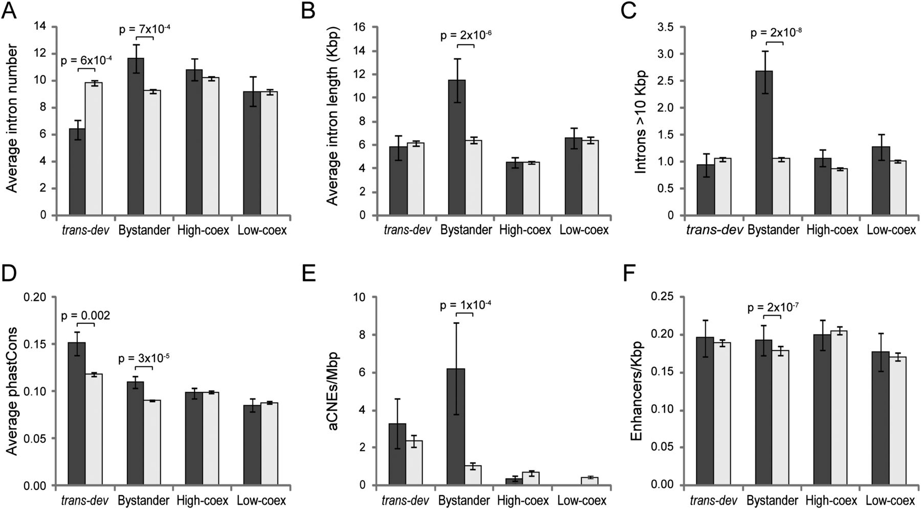 Different functional and evolutionary features of intragenic sequences of conserved pairs. (A) Average intron number for each gene type. (Dark gray) Conserved pairs; (light gray) control set. Putative human bystander genes (nondevelopmental genes associated with trans-dev genes in conserved pairs) have significantly more introns on average than the control set (P = 7 × 10−4, KS test), whereas associated trans-dev genes have fewer (P = 6 × 10−4, KS test). Genes in highly coexpressed or lowly coexpressed conserved pairs have similar average intron numbers than the control set. (B) Average intron length (in Kbp). Putative bystander genes have significantly longer introns than the other genes (P = 2 × 10−6, KS test). (C) Average number of introns longer than 10 Kbp. Bystander genes have nearly three times more long introns than other genes (P = 2 × 10−8). (D) Average mammalian-wide phastCons score of intronic regions of different types of conserved gene pairs. Both trans-dev and bystander genes from conserved pairs show higher intronic sequence conservation than the nonconserved genes (P = 0.002 and P = 3 × 10−5, KS test), whereas conserved highly coexpressed nondevelopmental gene pairs show higher conservation than the control set at the intergenic region. (E) Density of ancient conserved noncoding elements (aCNEs) per Mbp in introns of different types of conserved gene pairs. (F) Density of functionally defined strong enhancers per Kbp in introns of different types of conserved gene pairs. Error bars correspond to standard errors.