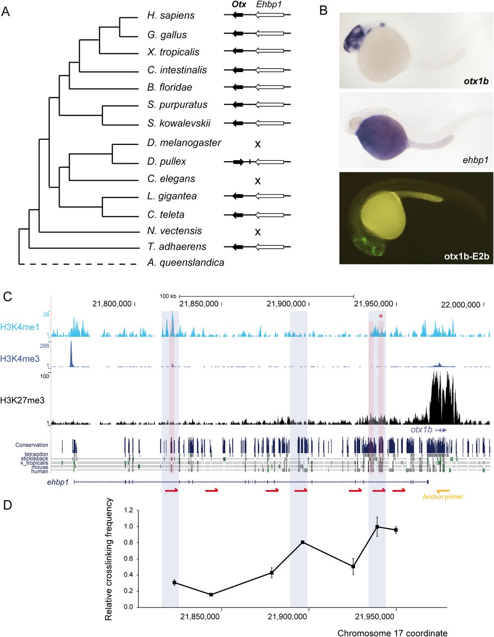 Functional characterization of the GRB of otx1b-ehbp1 in zebrafish. (A) Phylogenetic distribution of the GRB across the studied metazoan species. The GRB was not conserved in D. melanogaster, C. elegans, and N. vectensis. (B) Top and middle panels are zebrafish embryos at 24 hpf showing the expression of otx1b and ehbp1 genes. otx1b is detected in the anterior brain, while ehbp1 is expressed in the yolk. (Lower panel) GFP expression promoted by an enhancer located within the intron of ehbp1 (asterisk in C). This enhancer is active in most tissues expressing otx1b. (C) Distribution of H3K4me3, H3K4me1, and H3K27me3 tracks along the otx1b-ehbp1 GRB in 24-hpf zebrafish embryos. H3K4me1 peaks tested for enhancer activity in zebrafish stable transgenic lines are shaded in red. The regions that physically interact in 3C assays with the otx1b promoter are shaded in blue. H3K27me3 distribution indicates that otx1b, but not ehbp1, has tissue-specific expression; hence, H3K4me1 enhancers located in ehbp1 introns are likely acting on otx1b. (Below) conservation track from the UCSC Genome Browser. (D) Graph showing a 3C experiment to detect interaction between different ehbp1 intronic regions and the otx1b promoter in 24-hpf embryos. A fixed primer (yellow arrow) was set at the otx1b promoter, and seven regions were assayed for interaction with that promoter using different primers (red arrows) distributed along the ehbp1 intronic genomic area. The highest cross-linking frequency value is set to 1. Error bars indicate standard error (n = 3).