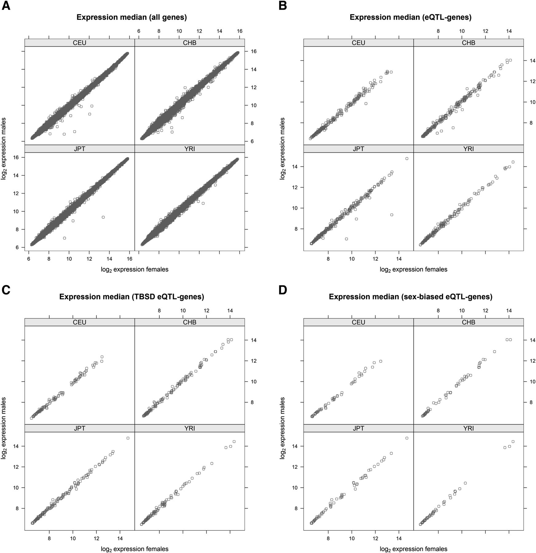 Comparison of female (x-axis) versus male (y-axis) expression medians. Log2 expression medians were compared across the sexes for (A) all genes, (B) eQTL-genes, (C) TBSD eQTL-genes, and (D) sex-biased eQTL-genes. In all cases, the correlation between log2 expression levels in females and males was found to be very high (r2 = 0.99 and p < 10−4), suggesting that expression level differences between sexes are not the primary driver of eQTL discovery.