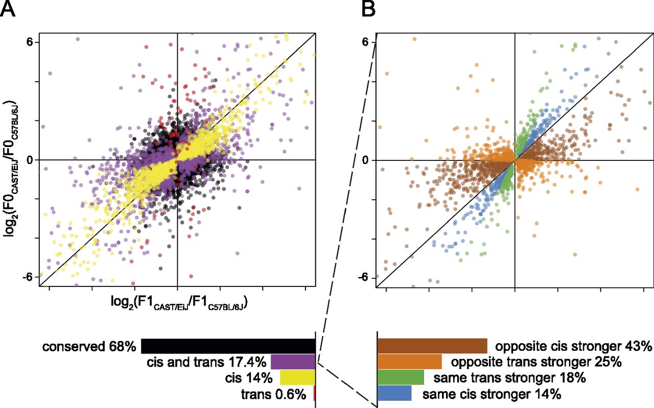 Classification of genes according to their pattern of gene expression divergence. The average log2 expression fold change between the alleles in the hybrids (F1) and between the parental strains (F0s) is plotted on the x- and y-axis, respectively. (A) Genes for which the expression levels have not diverged between the two strains are classified as conserved (colored black), while genes in which expression has diverged are classified as cis, trans, or cis and trans according to whether the divergence is explained by at least one regulatory variant acting in cis (colored yellow) or in trans (colored red), or by at least two regulatory variants, one in cis and one in trans (colored purple). (B) Subdivision of the cis and trans category. The regulatory variants can cause gene expression changes in the same direction with the regulatory variant in cis having a stronger effect on expression change than the regulatory variant in trans (blue), or the variant in trans having a stronger effect than the variant in cis (green). Expression changes can also be in opposite directions with the variant in cis having a stronger effect than the variant in trans (brown), or the variant in trans having a stronger effect than the variant in cis (orange).
