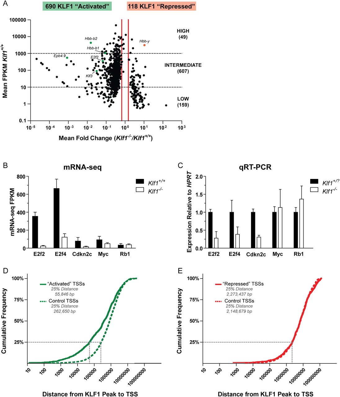 mRNA-seq reveals a comprehensive set of KLF1 activated genes. (A) A scatter plot representation of mRNA-seq expression data. Each data point represents a single RefSeq gene plotted according to the mean fold change between Klf1 genotypes (x-axis) and the mean Klf1+/+ expression (y-axis). The identity of several data points is indicated for reference. Vertical red lines indicate the 1.5-fold differential expression cutoff to define the KLF1 “activated” (decreased expression in Klf1−/− samples) and KLF1 “repressed” (increased expression in Klf1−/− samples). Genes were further sorted according to their mean Klf1+/+ expression into high, intermediate, and low expression categories. This data set is available as Supplemental Table S1. (B) mRNA-seq quantification by FPKM values. Each bar represents the mean FPKM + 95% confidence interval for three independent biological replicates. (C) qRT-PCR validation of mRNA-seq data. Each bar represents the mean + SEM for at least three independent biological replicates. Gene expression was normalized to the housekeeping gene HPRT and wild-type expression level. Klf1+/? is used to indicate that both Klf1+/+ and Klf1+/− samples were considered together. (D) Cumulative frequency distribution for the distances between KLF1 “activated” TSSs and KLF1 ChIP-seq peak locations (solid green line). The average distribution for 10 randomly simulated controls is also shown (dashed green line). (E) Cumulative frequency distribution for the distances between KLF1 “repressed” TSSs and KLF1 ChIP-seq peak locations (solid red line). The average distribution for 10 randomly simulated controls is also shown (dashed red line).