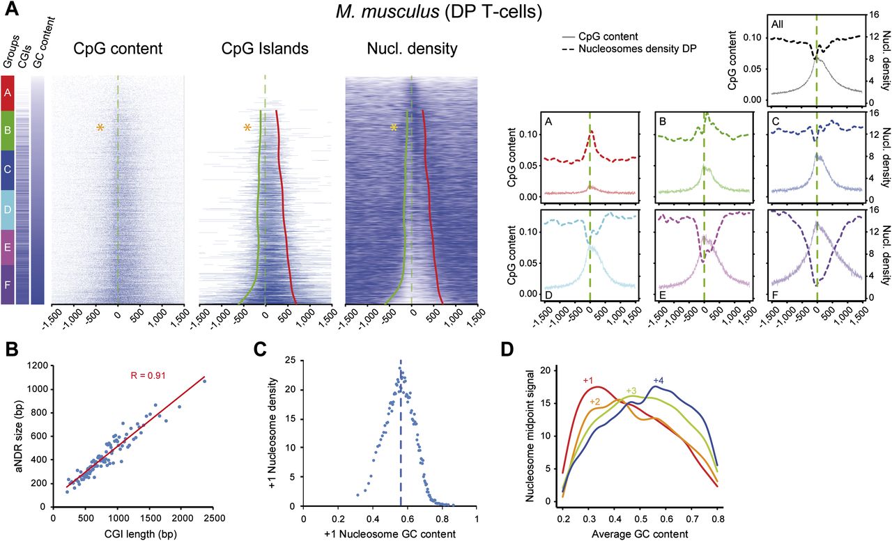 GC content at promoters conditions +1 nucleosome strength and correlates with aNDRs in GC-rich areas. (A) Heat maps of CpG dinucleotides, CpG islands, and nucleosome density, ordered by increasing GC content, in murine DP T-cells at all 8634 promoters (excluding those in close proximity to other annotations) and centered on the TSSs. On the left of the heat maps, the six groups A–F (red to violet boxes) of increasing GC content are represented along with the presence of CGIs in each group (blue bar represent CGIs, and white bars non-CGI promoter). The percentages of CGI promoters in each group from top to bottom are 4%, 34%, 55%, 65%, 78%, and 93%. Therefore, the first two groups can be classified as CGI-poor. The profiles of CpG content and nucleosome densities for all promoters (top) or the six subgroups A–F are shown on the right. The red and green lines on the CGIs and nucleosome density heat maps show the trend lines of the CGIs borders (see Methods) starting from group B because group A does not contain a significant amount of CGIs. (Orange stars) Transition point from which +1 nucleosome densities switch from a correlation to an anti-correlation pattern with GC content. (B) Correlation of CpG peak length and aNDR size within CGI-rich groups. A linear regression of CGI length versus nucleosome occupancy, divided into 80 classes, shows a high correlation (R = 0.91). (C) GC content correlate (in GC-low areas) and anti-correlate in GC-rich areas with MNase signal at +1 nucleosome proximity. Promoters were divided into 80 equal groups of increasing +1 GC content and plotted against MNase signal. Nucleosome density increases and then decreases after a 0.58 GC content threshold. (D) Transitions in the major nucleosome occupancy from position +1 to +4 with increasing GC content. Occupancy levels for +1 to +4 nucleosomes were measured around the midpoint position calculated on all promoters.
