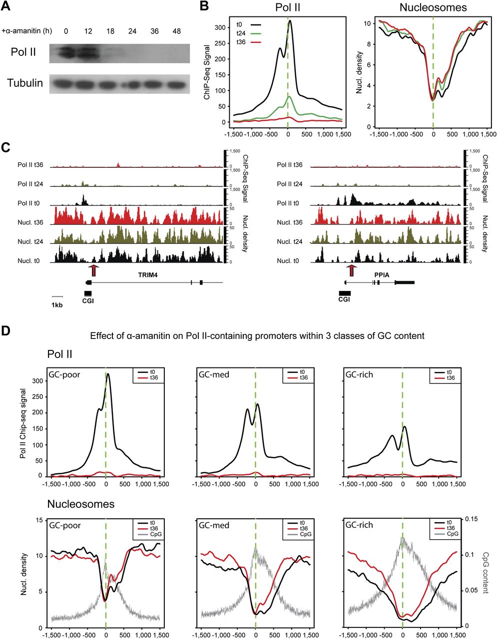 Pol II disruption in vivo reduces aNDRs only moderately and results in an increase of the +1 nucleosome. (A) To investigate the effect of Pol II presence on aNDRs, we stripped Pol II from the chromatin by treating the human Raji B-cell line with α-amanitin for the indicated time points. Western blot samples were analyzed at 12 h, 18 h, 24 h, 36 h, and 48 h and showed Pol II disappearance in the latter two points. Tubulin (lower panel) was used as an internal control to check equal protein loading. At t0, t24, and t36, Pol II ChIP-seq and MNase-seq experiments were performed as indicated. (B) Genome-wide analysis of nucleosome occupancy and Pol II recruitment following treatment at 1504 Pol II–enriched promoters (top 20%). As expected, Pol II signals around the TSS decreased over time (left). Nucleosome density slightly increased downstream from the TSS, indicating narrowing of the effective aNDR area (right) and an increase of the +1 nucleosome. (C) Examples showing the difference of Pol II occupation and nucleosome density across the TRIM4 and PPIA genes. ChIP-seq and MNase-seq data were scaled such that the represented units correspond to an equivalent amount of sequenced tags. (Arrow) Position of the +1 nucleosome. (D) Effect of GC content on aNDRs after Pol II removal. Three groups of GC content were built for the group of Pol II–enriched promoters shown in B. CpG scores, nucleosome densities (bottom panels), and Pol II ChIP-seq signal (top panels), before and after treatment are displayed. A stronger aNDR reduction, but not disruption, is observed for the group with the highest GC (and CpG) content.