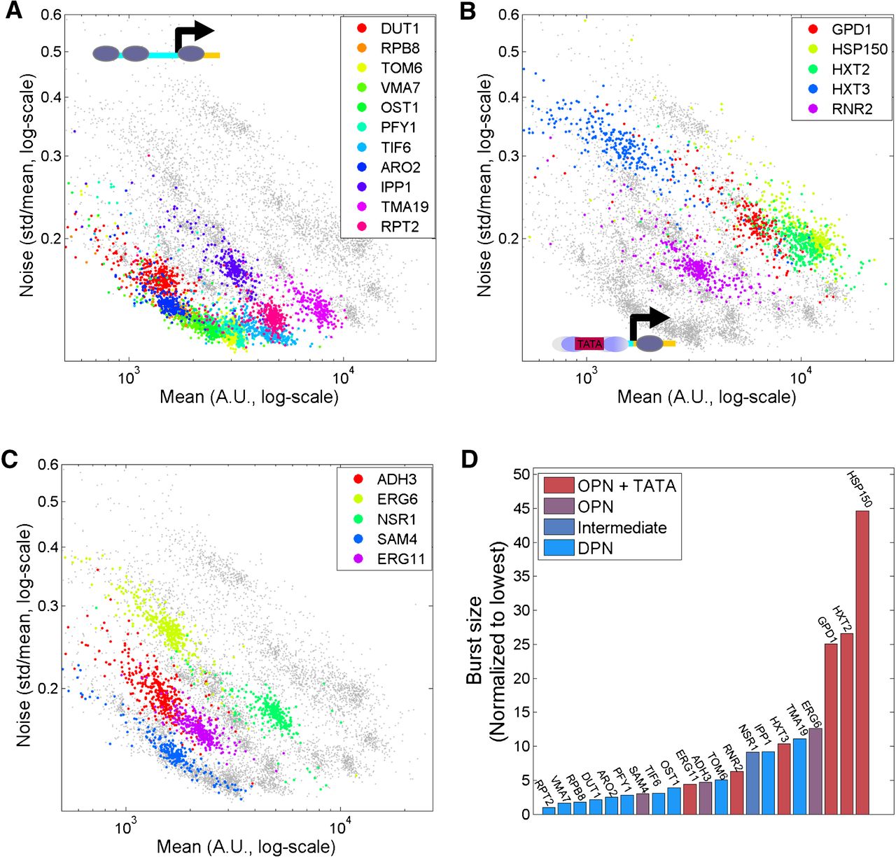 Scaling of noise with mean abundance. (A) Noise properties of NFR-containing, TATA-less promoters. Noise versus mean expression is shown for 11 promoters with a clear NFR and no TATA box. Different colors correspond to different promoters, as described. (B) Noise properties of TATA-containing promoters without NFR. Same as A for promoters that lack NFR and that contain a TATA box. (C) Noise properties of “intermediate” promoters. Same as A for promoters with intermediate nucleosome occupancy or occupied promoters with no TATA. In plots (A–C) the gray points in the background are pooled from all libraries. The values for mean and noise are provided as Supplemental Data. (D) Burst size for different promoters. The burst size was estimated by fitting the data to η2 = b/m + ηext2 (Methods), and normalized to the lowest burst size (RPT2). Promoters are ordered based on increase in burst size and colored based on nucleosome occupancy (OPN/DPN) and existence of TATA box.