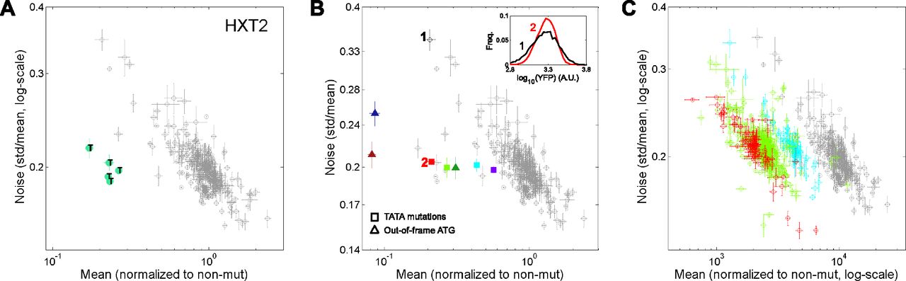 Mutations that deviate from the noise–mean scaling. (A) Noise versus mean expression of mutants of the HXT2 library. (Green) Mutants that deviate from the noise–mean scaling and were sequenced. Those that had a mutated TATA are denoted by T. (B) Mutations that eliminate the TATA box or introduce an unproductive ATG reduce burst size. Mutations were directed into the HXT2 promoter to eliminate the TATA box (squares: red, TATgAAAA; green, TATAgAAA; cyan, TATAAAcA; purple, TAcAAAAA) or to introduce an out-of-frame ATG in different positions (triangles: red, 13; blue, 34; green, 23). (Inset) Single-cell distributions of expression from two mutants of similar expression but different noise (marked by 1 and 2 in the figure). (C) TATA box mutations modify the scaling law. The three TATA mutants shown in B were subjected to further random mutagenesis and the resulting mutants are shown. Color code as in B. (Error bars) Standard error of three biological repeats. Similar analysis is presented for GPD1 and HSP150 in Supplemental Figure S3.