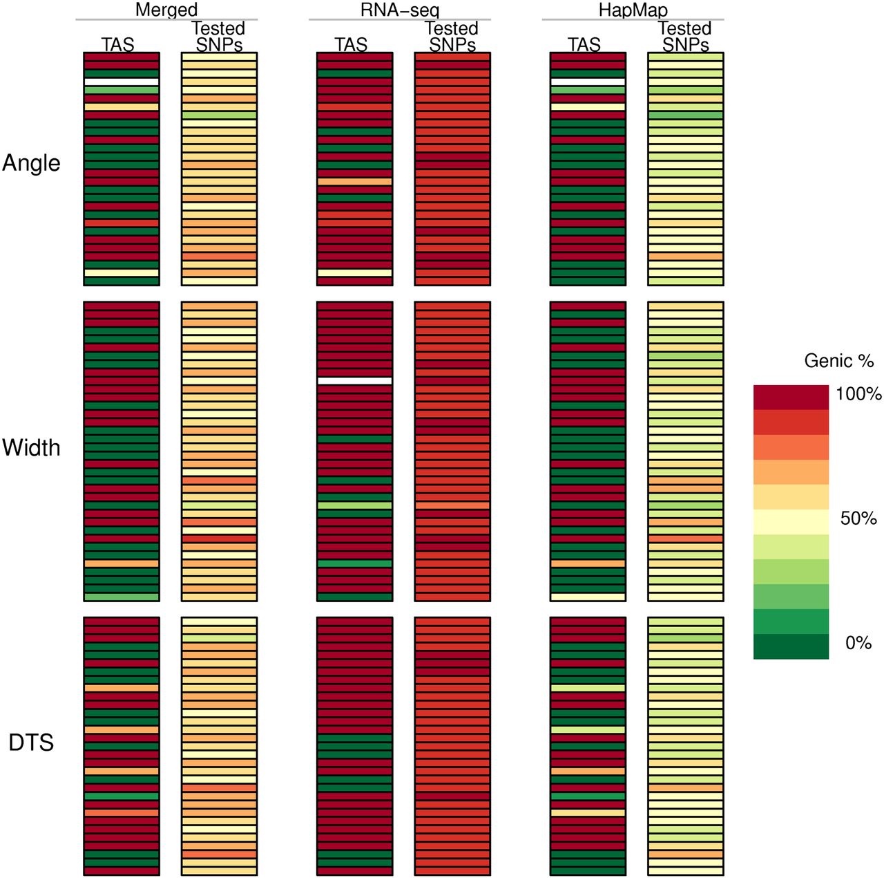 Genic or nongenic TASs for each dissected QTL region and the proportion of genic SNPs among all tested in the region. Genic region is defined as from the transcription start site to the end of 3′ UTR. With the merged data set, the probability of a TAS being genic or nongenic is significantly independent of whether more genic or nongenic SNPs in the target region are tested (P < 0.05) for all five traits. Each row represents a single QTL region for the indicated trait. Genic and nongenic TASs are equally likely to be identified for QTLs with large or small effects, which are sorted in descending order within each trait. (DTS) Days to silking.