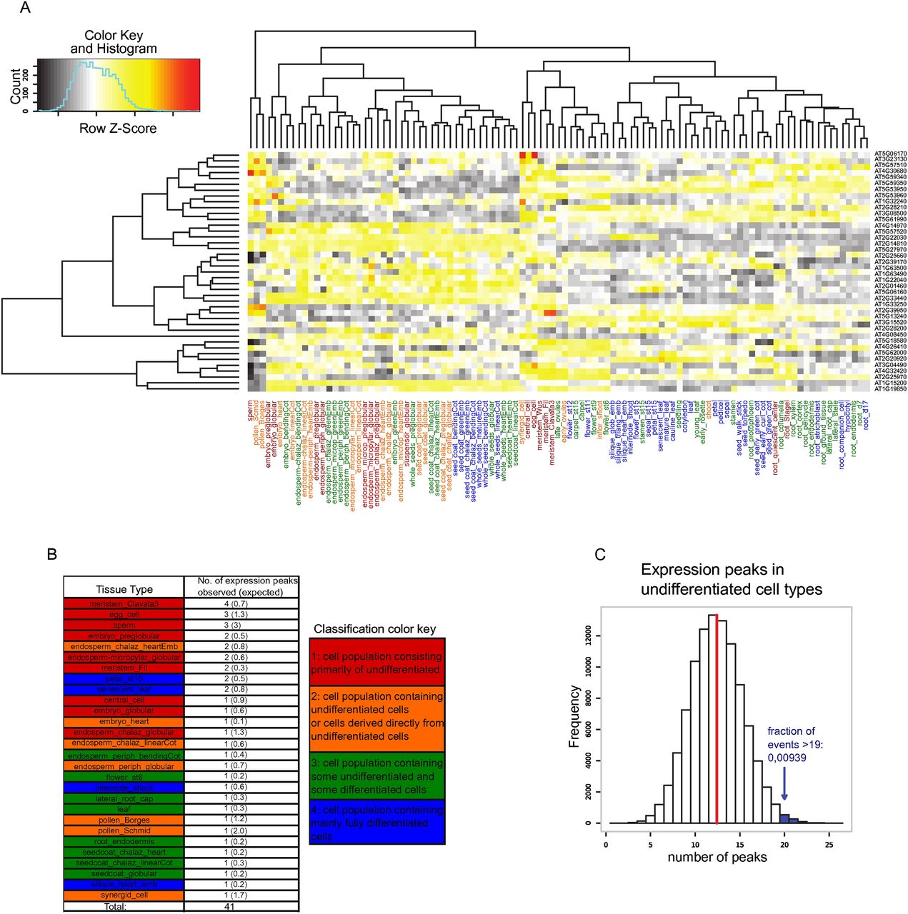 ULE-associated genes are developmentally regulated. (A) Heatmap representing color-coded relative expression among a large collection of Arabidopsis tissues/cell types. (Dark colors) Low expression; (bright colors) high expression. Expression values were scaled per row (i.e., per gene) to visualize expression peaks of a transcript across developmental stages. Per-gene as well per-tissue clustering was applied to visualize patterns in the expression profiles. Sample descriptions are color-coded as described in B. Only ULE-associated transcripts represented on the ATH1 array are shown (41/56). (B) Table of tissues in which expression peaks of ULE-associated genes occur. The color code indicates the differentiation state of the respective tissue/cell type. (C) ULE-associated gene expression peaks are significantly enriched in undifferentiated cells. The number of events where the maximal mean expression signal for one of 41 ULE-associated genes was found in undifferentiated cell types (i.e., gametes, shoot meristem cells, root quiescent center, and early embryo/endosperm) is significantly higher than expected by chance. The histogram depicts the frequencies of expression peaks occurring in undifferentiated cell types among groups of 41 genes randomly sampled from the whole array. Resampling of random groups indicated that the same or higher number of expression peaks in undifferentiated cell types occurs only in 939 out of 100,000 instances (P = 0.00939).
