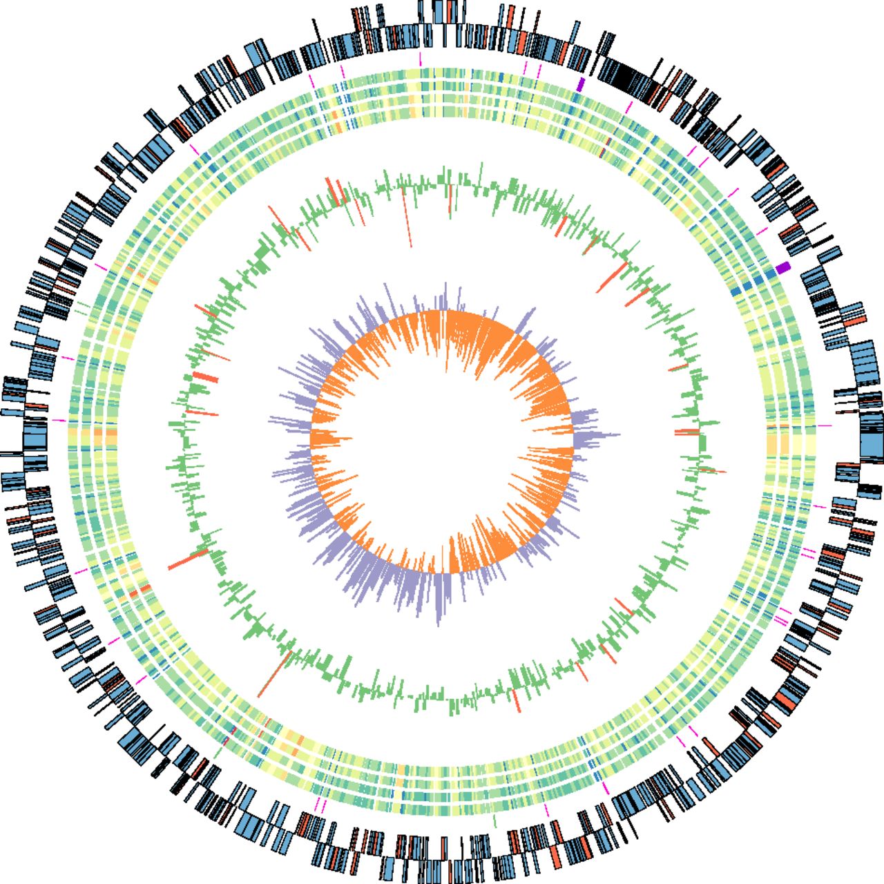 The chromosomal structure of wOo. Circles are numbered sequentially from the perimeter to the center. Circles 1 and 2 represent protein-coding genes on the positive and negative strands, respectively, with intact CDS colored blue and pseudogenes in red; the third circle shows structural RNA genes (rRNA, purple; sRNA, green; and tRNA, pink); circles 4–7 are heat-maps of transcript counts in male soma (4, 5) and female gonad (6, 7), with high expression colored red and low expression in blue; circle 8 is a plot of differential expression (DE) between male soma (outer profile) and female gonad (inner profile), where red coloration indicates statistically significant DE at P < 0.05; and circle 9 represents the percentage of GC skew [(G – C)/(G + C)] for each DNA strand. Note that expression from tRNA and rRNA genes was forced to baseline to facilitate visualization of mRNA expression.