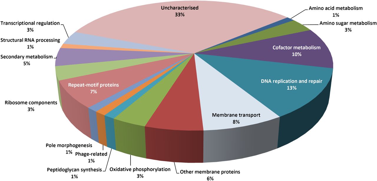 Gene loss from the wOo genome. Orthologous cluster analysis identified 88 genes that are present in wBm, wMel, wPip, and wRi but that are lost or pseudogenized in wOo. These genes were manually classified into functional categories using the National Center for Biotechnology Information Conserved Domain Database.