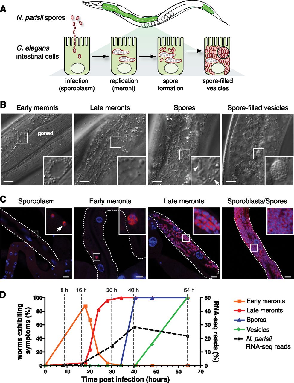 Characterization of N. parisii infection stages in C. elegans. (A) Diagram of infection stages. N. parisii infects C. elegans intestinal cells (green), where it grows intracellularly from small mononucleate sporoplasms to large, multinucleate meronts. Meronts develop into spores, which at late stages of infection can be enclosed within vesicles. (B) Representative DIC images of animals are shown displaying distinct infection-associated phenotypes with boxed areas enlarged and shown as insets. (Arrow) Small spore; (arrowhead) large spore. (C) N. parisii–specific FISH (red) and DAPI (blue) staining of animals at different stages of infection. Note: Although animals do not exhibit infection symptoms by DIC at 8 hpi, sporoplasm is visible by fluorescent in situ hybridization (FISH) at 8 hpi. (B,C) Scale bar, 10 μm. (D) The y-axis on the left indicates the fraction of animals in a population exhibiting specific symptoms of infection visualized by DIC (n > 22 animals assayed per time point) (see Supplemental Methods). RNA sample collection times are indicated on the graph: (1) 8 hpi, during the sporoplasm stage as observed by FISH; (2) 16 hpi, during the early meront stage; (3) 30 hpi, during the late meront stage; (4) 40 hpi, when spores have just started forming; and (5) 64 hpi, when Nematocida spores can be found within membrane-bound vesicles. The y-axis on the right indicates the contribution of N. parisii reads to total reads from RNA-seq analysis.