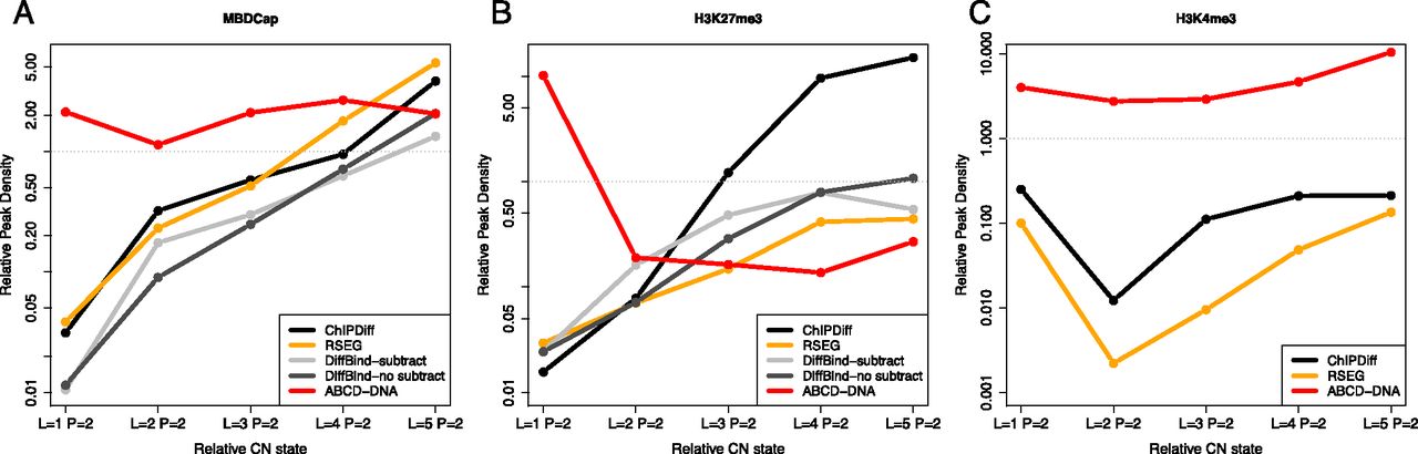 Association between differential peak detection and CNV across LNCaP/PrEC qDNA-seq data sets using various algorithms. The relative rate of peak detection (RRPD), defined as the ratio of the number of regions detected in LNCaP (L) cells to the number of regions detected in PrEC (P), within each CNV stratum is shown for ChIPDiff, RSEG, DiffBind (with and without input subtraction), and ABCD-DNA. DiffBind is based on MACS-detected regions. (A) MBDCap-seq; (B) H3K27me3-seq; and (C) H3K4me3-seq. Due to lack of replication, DiffBind was not run on H3K4me3-seq.