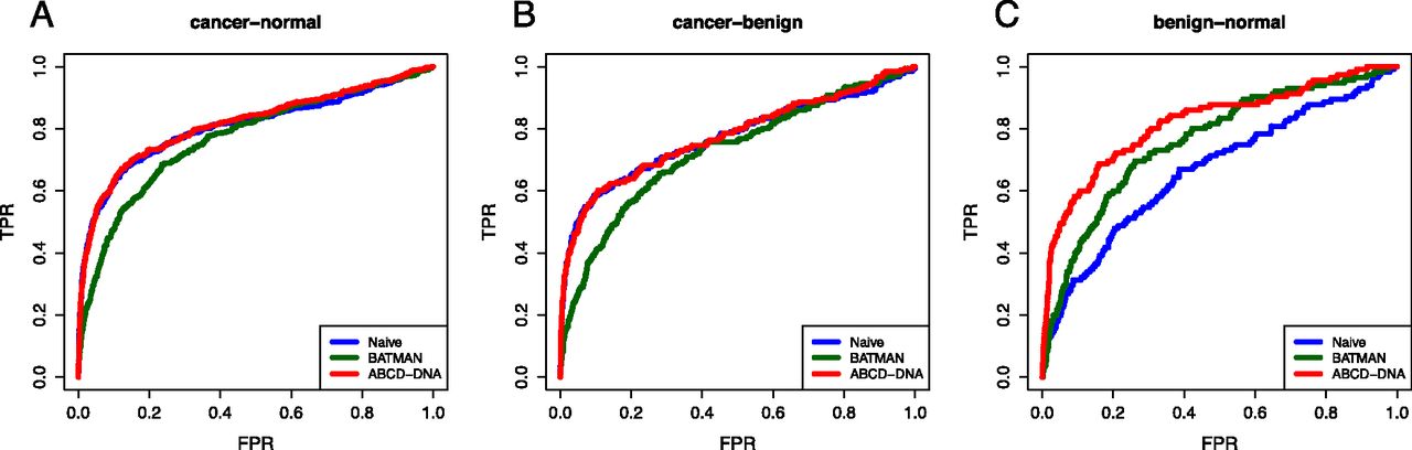 ABCD-DNA outperforms CNV-aware Batman. ROC curves (sensitivity versus 1 − specificity) for three pairwise comparisons are shown for a MeDIP-seq data set (Feber et al. 2011), where Illumina HumanMethylation 27k data is used as an independent source of truly and nontruly differentially methylated regions. “Batman” refers to the CNV-adjusted read densities before running the Batman algorithm and taking differences in methylation estimates. “Naive” refers to a count-based analysis, without accounting for CNV. “ABCD-DNA” refers to a count-based analysis, with additional offsets to account for CNV (estimated from Affymetrix SNP 6.0 data using the PICNIC algorithm). Comparisons are as follows: (A) cancer versus normal; (B) cancer versus benign; and (C) benign versus normal.