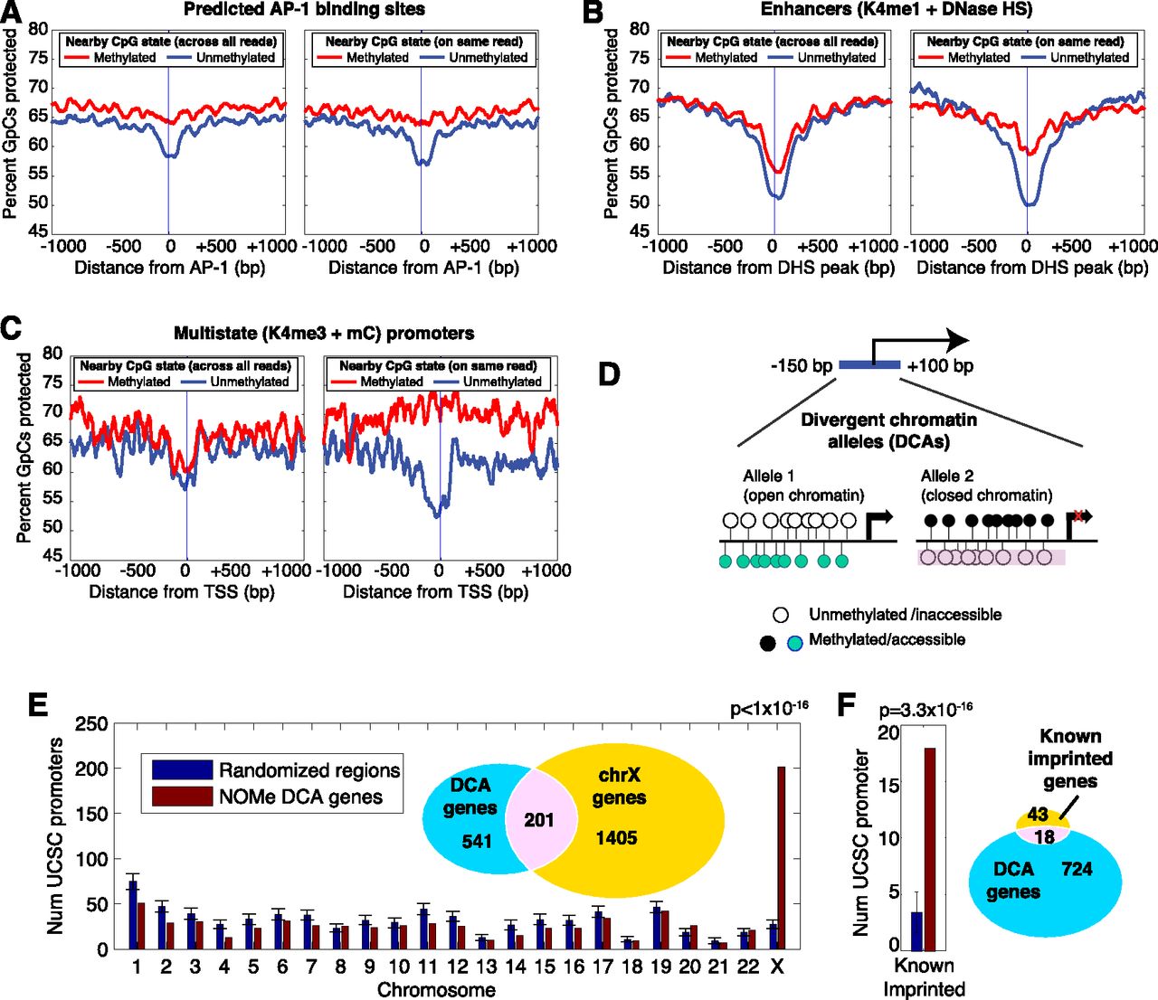 Combinatorial epigenomic signatures reveal functional chromatin. (A–C) Nucleosome occupancy levels (“percent of GpCs protected”) are shown stratified by the methylation status of nearby CpGs (within 20 bp). For each element type, this analysis was performed twice—once sampling randomly across all reads covering the same genomic position as the GpC (left plots, labeled “across all reads”) and a second time using only the methylation status from the same read (right plots, labeled “on same read”) (see Methods). All three examples show nucleosome depletion associated primarily with the unmethylated state, but while predicted AP-1 binding motifs (A) display this in both population and within-read profiles, enhancers and promoters marked by the opposing K4me3 and meC (B,C) show this association only in the within-read analysis. 0 refers to the center of the AP-1 binding motif (A), the peak of DNase HS within K4me1-marked regions (B) and TSSs (C). (D) Search strategy for finding divergent chromatin alleles (DCA) by searching TSS regions for at least two reads with opposing chromatin profiles in IMR90 cells. (E) Promoters that exist in both nucleosome-depleted and unmethylated and nucleosome-occupied and methylated are enriched on the X chromosome. Seven hundred and forty-two DCA genes were compared to randomized sets of 742 genes—1000 trials were performed and the standard deviation is shown for the number on each chromosome. A P-value was determined from the X chromosome using a binomial test with the probability determined by the random trials. (F) DCA genes were compared to 1000 randomized gene sets for the number within 50 kb of known imprinted genes.