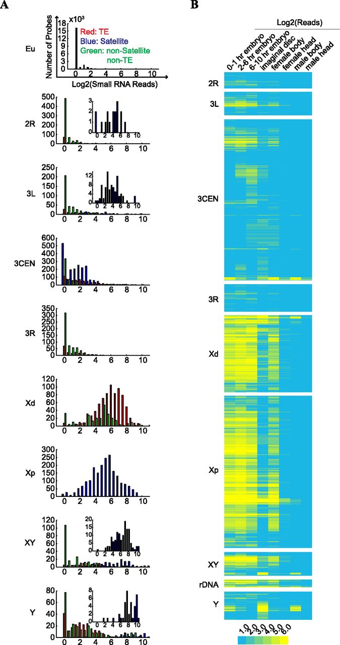 Generation of small RNA from the heterochromatic sequences. Sequence reads of small RNA libraries produced from 0 to 1-h embryos, 2 to 6-h embryos, 6 to 10-h embryos, imaginal discs, female bodies, female heads, male bodies, or male heads (Chung et al. 2008) were aligned to the probe sequences, and the number of reads that match each probe was measured. (A) Heterochromatic regions differ in their production of small RNAs corresponding to different types of repetitive sequences. All show overall higher levels of small RNA than that of the euchromatic genes (Eu), but between different heterochromatic regions the overall abundance of small RNAs and the type of repetitive sequences they originate from vary substantially. Inset highlights the log2(small RNA reads) of the major satellite DNAs at the region. (B) Temporal profile of small RNA expression. Heat map showing log2 (small RNA reads) at different developmental stages.