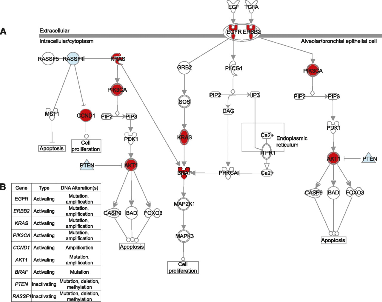 Activation of EGFR signaling in non-small-cell lung cancer (NSCLC) can occur via disruption of several different components at multiple levels of the pathway. (A) Different proteins in the EGFR pathway can be activated (red) or inactivated (blue) by underlying genetic or epigenetic changes at the DNA level, leading to aberrant pathway activity and oncogenic signaling in NSCLC. Examples of key oncogenes affected include EGFR, RAS, PIK3CA, and AKT. Conversely, examples of tumor suppressors that are inactivated include PTEN and RASSF1. (B) Genetic and epigenetic mechanisms responsible for the disruption of genes in the EGFR signaling pathway in NSCLC include DNA copy number alterations (amplification or deletion), point mutations, and DNA methylation changes. Thus, it is important to consider multiple aspects of the genome and epigenome simultaneously to elucidate the mechanisms driving pathway deregulation. This illustration was generated using Ingenuity Pathway Analysis software.