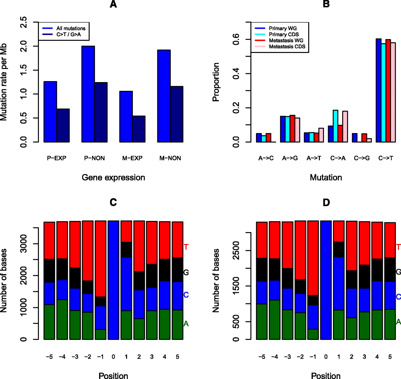 Somatic SNVs analysis in acral melanoma samples. (A) Somatic SNV mutation rates of all SNVs and C>T/G>A transitions for expressed genes in the primary (P-EXP) and metastatic tumors (M-EXP) and nonexpressed genes (P-NON and M-NON). (B) Proportion of somatic SNVs by class in the primary and metastatic tumors for the whole genome (WG) and coding regions (CDS). (C) Frequency of bases ±5 bp of whole genome C>T/G>A transitions in the primary tumors. (D) Frequency of bases ±5 bp of whole genome C>T/G>A transitions in the metastatic tumors.