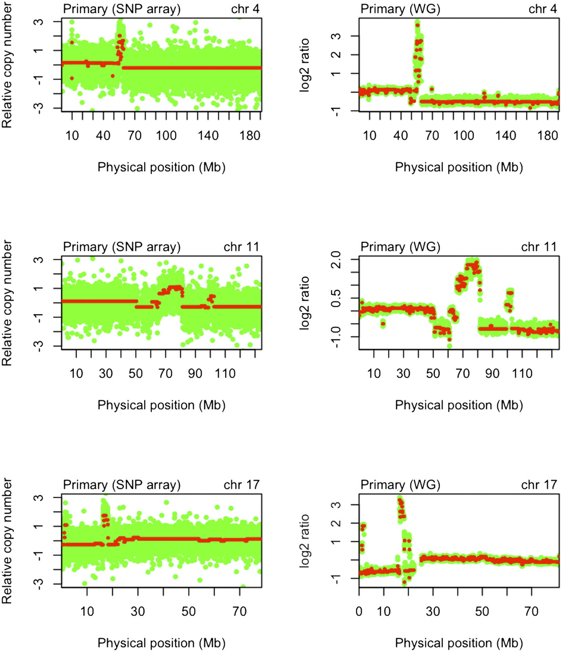 Copy number alterations in the primary tumor. SNP array plots showing somatic copy number alteration (CNA) in the primary tumor detected by genome-wide SNP arrays (left column) and whole-genome (WG) sequencing normalized read-depth per 10 kb (right column) for chromosomes 4, 11, and 17.