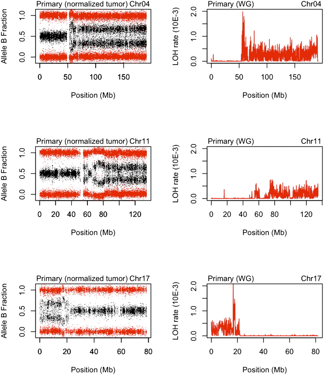 Loss of heterozygosity in the primary tumor. SNP array plots showing loss of heterozygosity (LOH) in the primary tumor as detected by allele B frequency from SNP array (left column) and whole-genome sequencing LOH rate in 100-kb windows (right column) for chromosomes 4, 11, and 17.