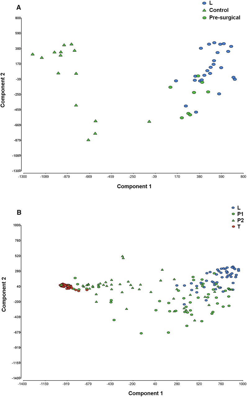 Principal component analysis (PCA) of SNP/CN markers separates plasma DNA of presurgical breast cancer patients from healthy female controls. (A) PCA profiles of 15 presurgical breast cancer patients and eight healthy controls showing clear separation of the plasma DNA profiles. The plasmas of healthy female controls clustered with normal leukocytes (blue circles). (B) PCA profiles of 50 patients on follow-up, showing separation of normal leukocytes and tumor DNA, with P1 and P2 samples scattered between these. Control indicates healthy female controls; presurgical, plasma of presurgical breast cancer patients; L, normal leukocyte DNA; P1 and P2, first and second plasma samples of patients on follow-up; and T, FFPE tumor DNA.