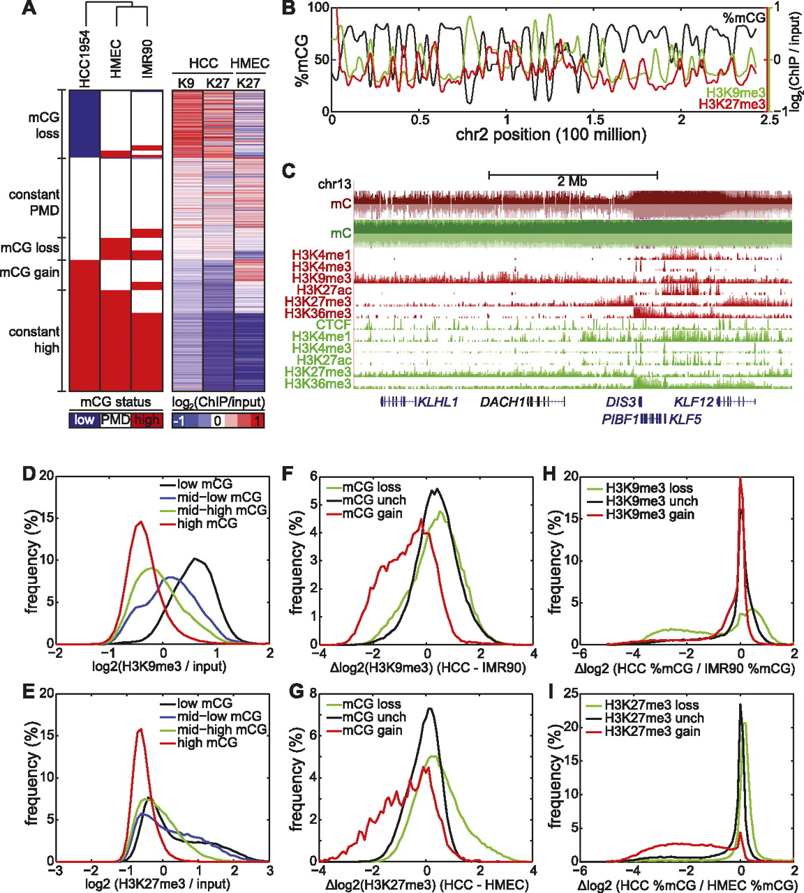 Repressive chromatin is depleted of mCG. (A) (Left) A reproduction of Figure 1D; (right) each of the 282,109 rows represents the H3K9me3 (denoted K9) and H3K27me3 (denoted K27) status in HCC1954 and HMEC, in the same order as the left panel. (B) Distribution of %mCG, H3K9me3, and H3K27me3 on chromosome 2 for HCC1954. (C) A large domain of DNA hypomethylation near the DACH1 tumor suppressor coincides with H3K9me3 and H3K27me3 in HCC1954. (Red) HCC1954, (green) HMEC. (D) Distribution of H3K9me3 enrichment for four quantiles of DNA methylation status in HCC1954. (E) As in D, but for H3K27me3. (F) Distribution of change in H3K9me3 in HCC1954 compared with IMR90 for 10-kb windows that lose mCG, gain mCG, or are unchanged for mCG. Δlog2 (H3K9me3) = log2 (HCC1954 H3K9me3/input) − log2 (IMR90 H3K9me3/input). (G) As in F, but for H3K27me3 comparing HCC1954 with HMEC. (H) Distribution of change in mCG in HCC1954 compared with IMR90 for 10-kb windows that lose H3K9me3, gain H3K9me3, or are unchanged for H3K9me3. (I) As in H, but for H3K27me3 comparing HCC1954 with HMEC.