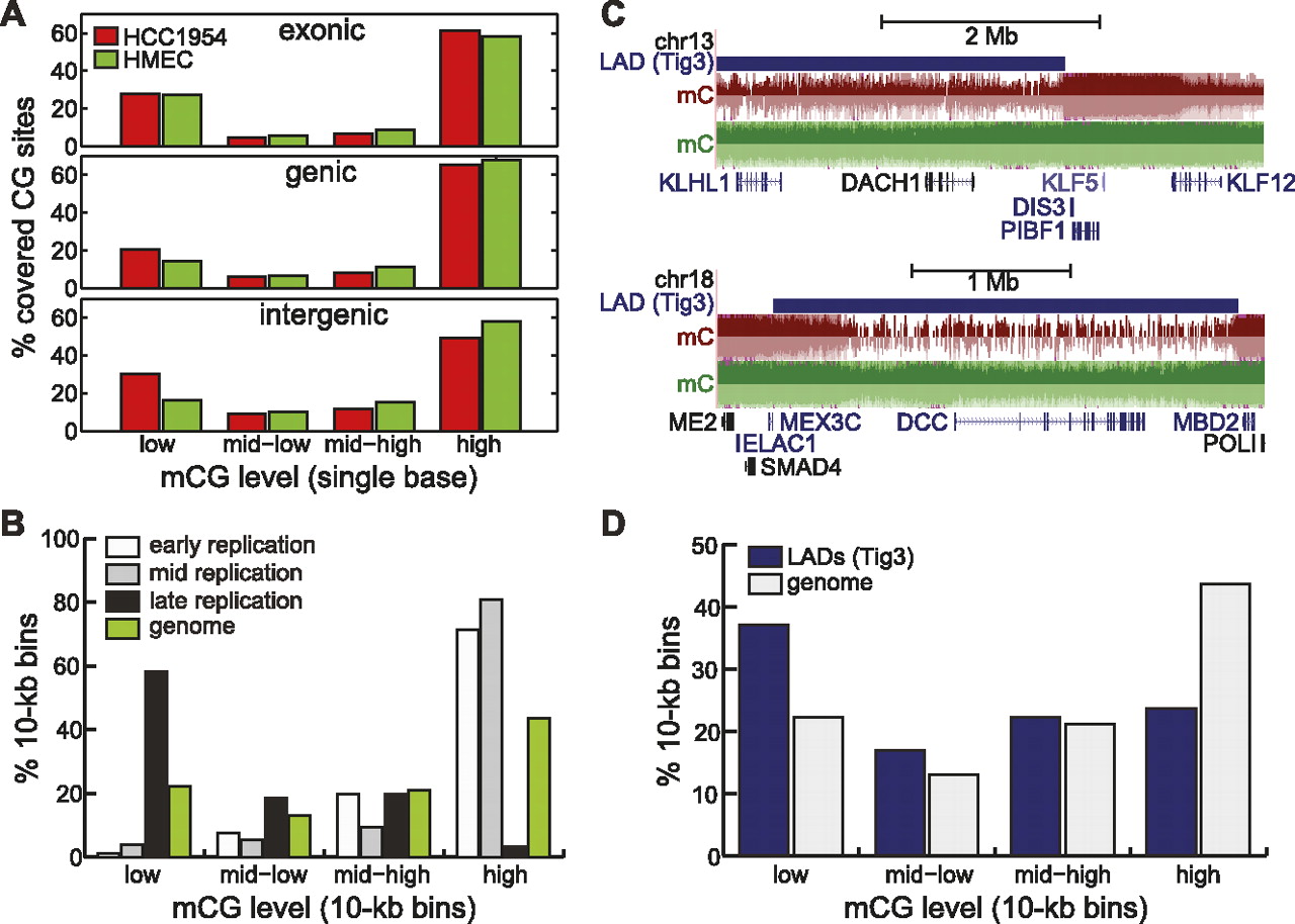 A passive model of hypomethylation. (A) Distribution of HCC1954 %mCG for exonic (top), genic (middle), and intergenic (bottom) cytosine residues. (B) Distribution of HCC1954 %mCG for 10-kb regions that are consistently early-, middle-, and late-replicating in four cell types (Hansen et al. 2009), compared to the background genome (green). (C) Snapshots illustrating the overlap of hypomethylated regions with lamina-associated domains previously mapped in Tig3 cells (Guelen et al. 2008), at the DACH1 (top) and DCC (bottom) genes. (D) Distribution of HCC1954 %mCG for 10-kb regions that are found in Tig3 lamina-associated domains (blue), compared to the background genome (gray).