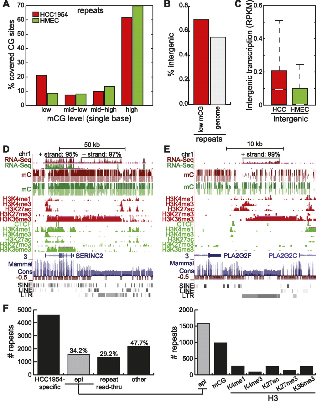 Epigenetic contribution of increased repeat expression. (A) Distribution of %mCG of each repeat-associated cytosine residue spanned by at least 10 methylC-seq reads. (B) Percentage of all repeats (gray) and of lowly methylated repeats in HCC1954 (red) that are intergenic. (C) Distribution of intergenic repeat expression in HCC1954 and HMEC, expressed in RPKM. (White line) median, (box) 25th to 75th percentiles. (D) Snapshot of repeat expression and read-through with epigenetic signatures near the SERINC2 gene. RNA-seq strand distribution shown on top. (E) Snapshot of repeat expression and read-through with epigenetic signatures near the PLA2G2F gene. RNA-seq strand distribution shown on top. (F) Number of highly expressed repeats specific to HCC1954 and the number that can be explained by at least a 50% change in epigenetic modifications or read-through transcription from nearby repeats. (Epi) epigenetic.