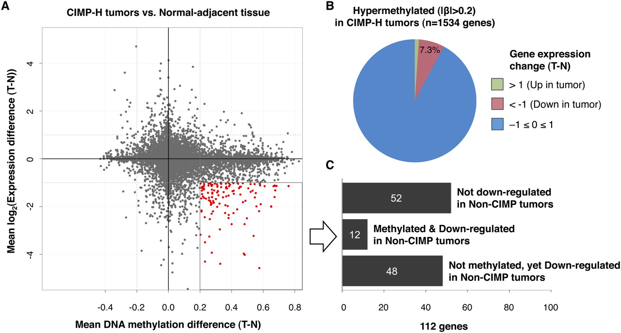 Integrated analysis of gene expression and promoter DNA methylation changes between colorectal tumors and matched normal adjacent tissues. (A) Mean DNA methylation β-value differences between CIMP-H tumors and matched normal colonic tissues (n = 6) are plotted on the x-axis, and mean log2-transformed gene expression value differences are plotted on the y-axis for each gene. Red data points highlight those genes that are hypermethylated with a β-value difference >0.20 and show more than twofold decrease in their gene expression levels in CIMP-H tumors. (B) Pie chart showing the gene expression changes of 1534 hypermethylated genes in CIMP-H tumors compared with adjacent normal tissues. (C) Bar chart showing the number of genes that exhibit DNA hypermethylation and/or gene expression changes in non-CIMP tumors among the 112 genes that are hypermethylated and down-regulated in CIMP-H tumors.