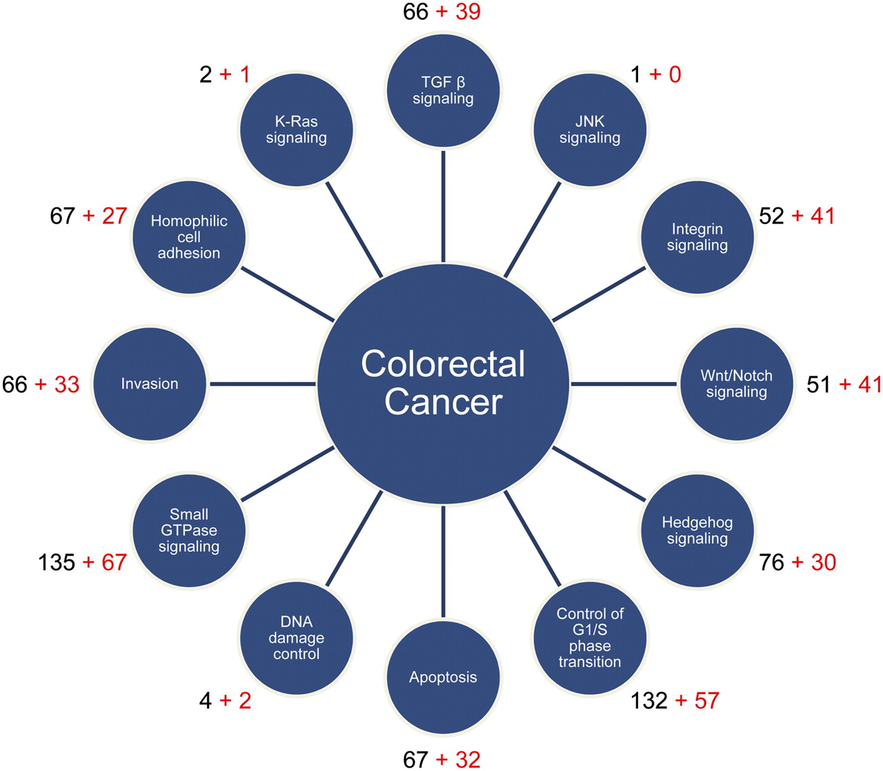 Differentially methylated genes mapped to the 12 core cancer pathways. The 12 signaling pathways and processes that are most frequently altered in cancer are shown in satellite circles. The number of differentially methylated genes mapped to each of the 12 categories is indicated next to each circle. (Black numbers) The number of genes shared by all tumors; (red numbers) the number of additional genes unique to CIMP tumors.