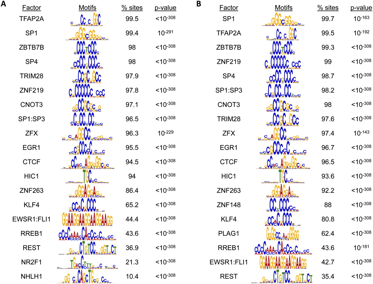Motif analysis for differentially methylated sites. Motif analysis for hypermethylated sites shared by all tumors (n = 3780) (A) and CIMP-specific hypermethylated sites (n = 2026) (B). The frequency of observing each motif within each subset of sequences is expressed as a percentage (% sites). The P-value of enrichment testing for individual motif in each data set is indicated.