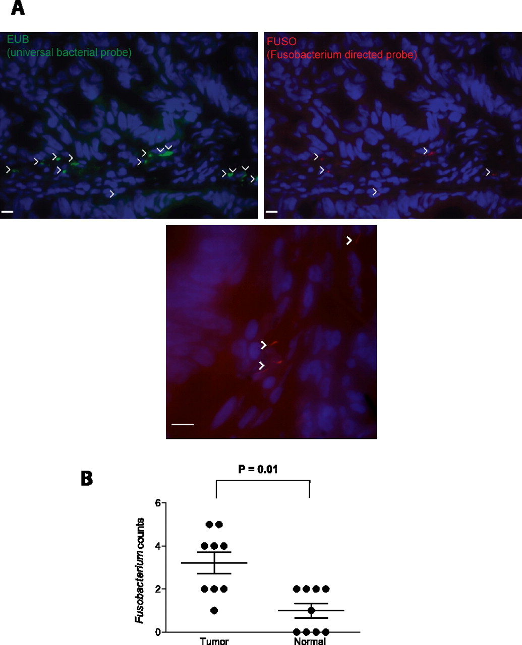 Fluorescence in situ hybridization (FISH) detects enrichment of Fusobacteria in colorectal tumors. (A) FISH using an Oregon-Green 488-conjugated ‘‘universal bacterial'' 16S rDNA-directed oligonucleotide probe (EUB338, green) (top left); and Cy3-conjugated Fusobacterium (FUSO, red) (top right and bottom center) 16S rDNA-direct oligonucleotide probe demonstrates the presence of bacteria and Fusobacterium within the colonic mucosa of colorectal tumor samples. Representative images are shown with a 10-μm scale bar in the lower corner of each panel; white arrowheads mark bacteria. Epithelial cell nuclei were stained with DAPI. (B) To determine whether Fusobacterium was enriched in tumor versus normal pairs, three random 40× fields were chosen for scoring by an observer blind to tumor/normal status, using selection criteria of mucosal tissue depth and a minimum of five bacteria visualized by the EUB338 probe per field. Each dot represents data from either a tumor or normal sample from nine tumor/normal paired cases. The mean, SEM, and P-values (calculated by a Wilcoxon matched-pairs signed rank test) are shown.