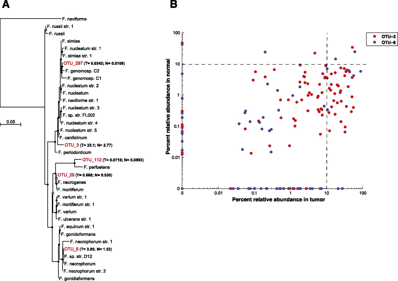 Phylogenetic analysis identifies several Fusobacterium species in human colon cancer tissues. (A) Approximately-maximum-likelihood phylogenetic trees were constructed on the V3–V5 region of the 16S rDNA gene using 31 reference Fusobacterium species along with the five most prominent OTUs identified in colon cancer specimens (indicated in red). Nodes that have bootstrap support above 50% and 75% are indicated with a white and black dot, respectively. The mean percent relative abundance in tumor (T) and normal (N) of each OTU is indicated in parentheses. The full names of the reference strains appear in Supplemental Table S6. (B) The abundance of the indicated OTU relative to all other phylotypes in a given specimen is shown for the two most abundant Fusobacterium OTUs in tumors (x-axis) and normal colon tissue (y-axis); each point represents tumor and normal abundance data for a different individual. The lower-right quadrant of the graph highlights the substantial proportion of patients for whom the Fusobacterium abundance is >10% in tumors but <10% in the matched normal.