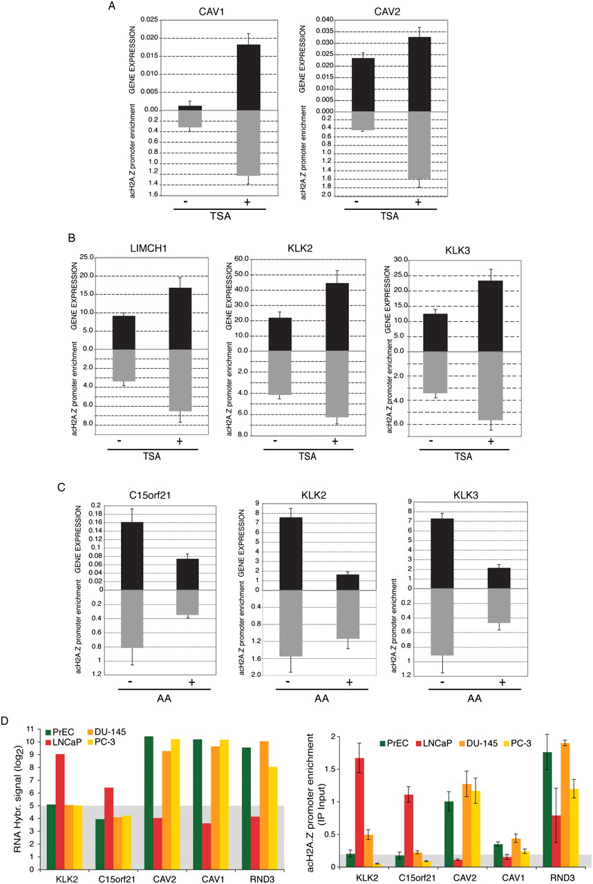 Acetylation of H2A.Z correlates with gene activation in prostate cancer. (A) LNCaP cells were either untreated (−) or treated (+) with Trichostatin A (TSA) at 100 nM for 48 h. Gene expression levels of CAV1 and CAV2 (A) or LIMCH1, KLK2, and KLK3 (B) genes were measured by RT–qPCR, and acH2A.Z levels at TSSs were measured by ChIP qPCR. Relative mRNA levels were normalized using ALAS1. A concordant increase in acH2A.Z and gene activation, after TSA treatment was observed for all genes. (C) LNCaP cells were either untreated (−) or treated (+) with Anacardic Acid (AA) at 90 μM for 48 h. Gene expression levels of C15orf21, KLK2, and KLK3 genes were measured by RT–qPCR, and acH2A.Z levels at the TSS were measured by ChIP qPCR. Relative mRNA levels were normalized using ALAS1. A concordant decrease in acH2A.Z and gene repression, after AA treatment, was observed. (D) (Left) Microarray hybridization signals for mRNA expression levels in PrEC (green), LNCaP (red), DU-145 (orange), and PC-3 (yellow) of five gene examples KLK2, C15orf21, CAV2, CAV1, and RND3. (Right) acH2A.Z ChIP qPCR at the promoter region of KLK2, C15orf21, CAV2, CAV1, and RND3 as per Figure 4. Gray background in the bottom panel highlights an arbitrary threshold for the minimum acH2A.Z signal associated with gene activation. Acetylation of H2A.Z correlates with gene activation in all gene examples.