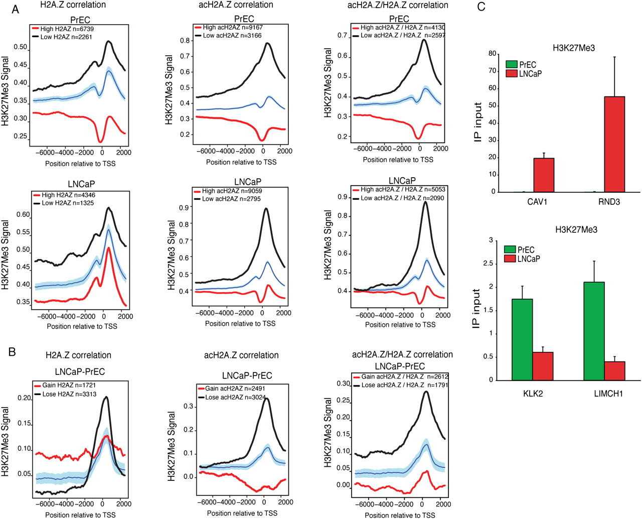 Anticorrelation between H3K27me3 and H2A.Z or acH2A.Z promoter presence in prostate cancer. (A) Significance plots of H3K27me3 signal comparing H2A.Z, acH2A.Z, and acH2A.Z/H2A.Z along gene promoters in genes sorted by high (red line) or low (black line) levels of H2A.Z, acH2A.Z, and acH2A.Z/H2A.Z in PrEC (top) and LNCaP (bottom). The selection criteria of H2A.Z, acH2A.Z, and acH2A.Z/H2A.Z for high levels were t-stats ≥ 1.5 (red line), and t-stats ≤ −1.5 for low levels (black line), as explained in the Supplemental Methods. (B) Significance plots of changes in the H3K27me3 signal (LNCaP-PrEC) along gene promoters in genes sorted by gain (t-stats ≥ 1.5, red line) or loss (t-stats ≤ −1.5, black line) of H2A.Z, acH2A.Z, and acH2A.Z/H2A.Z in LNCaP-PrEC. (C) ChIP qPCR using H3K27me3 antibody was performed to validate the anticorrelation in four different prostate cancer–related genes: CAV1 and RND3 (top) and KLK2 and LIMCH1 (bottom). See Figure 4 for validation of H2A.Z, acH2A.Z levels.