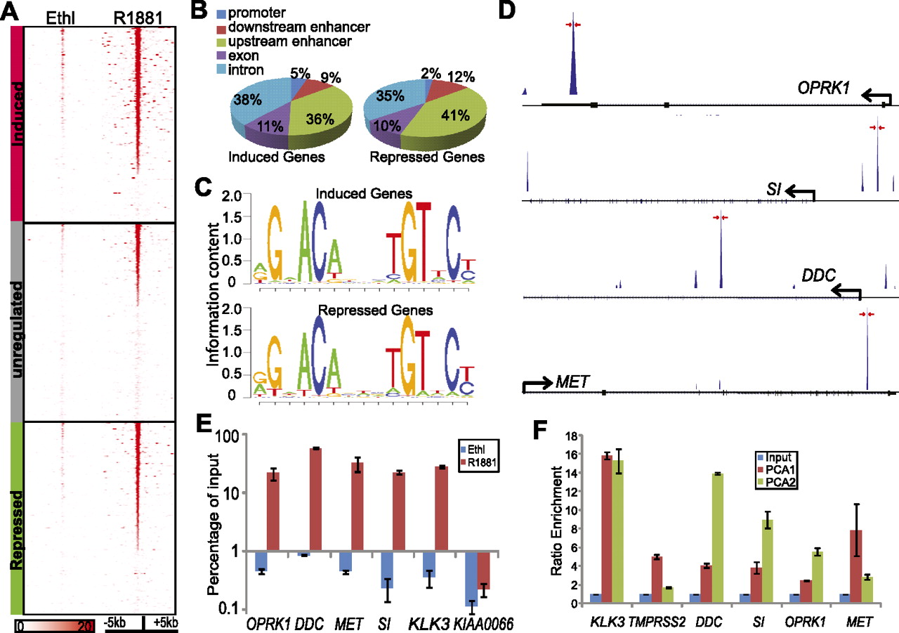 AR directly binds regulatory elements of androgen-repressed genes. (A) AR binding density of regions surrounding the highest peak (±5 kb) of genes induced, unregulated, or inhibited by androgen. AR ChIP-seq was performed in LNCaP cells treated with ethanol (Ethl) or synthetic androgen R1881 for 16 h. Each row represents one gene, and each column represents the binding intensity in each 100-bp window of the corresponding ChIP-seq experiment. Genes were sorted by the height of their highest AR binding peak in R1881 condition. AR ChIP-seq in Ethl condition was ranked according to R1881 condition. (B) Distribution of AR binding sites relative to AR-induced or AR-repressed genes. AR binding sites within the regulatory regions of AR-induced or -repressed genes were further categorized into promoter (within 5 kb upstream of the TSS site), enhancer, exon, and intron regions. (C) The most conserved DNA sequence motifs found in the AR binding sites of AR-induced and -repressed genes. De novo motif search was performed using MDscan of the top 500 AR binding sites associated with either AR-induced or -repressed genes. (D) ChIP-seq AR binding peaks on the regulatory elements of candidate AR-repressed genes. Genomic PCR primers (indicated by red arrows) were designed to flank the binding peaks. (E) AR directly binds to the regulatory elements of candidate AR-repressed genes in LNCaP cells. AR ChIP was done in LNCaP cells treated with Ethl or R1881 for 16 h. ChIP-PCR was performed using primers specific to each candidate gene (red arrows in D), KLK3, and a negative control, KIAA0066. Error bars: n = 3, mean ± SEM. (F) ChIP-PCR demonstrated AR binding to repressed genes in prostate cancer tissue. AR ChIP was performed in two human prostate cancer tissues. The input and ChIP DNA were first amplified by ligation-mediated PCR, and then an equal amount (50 ng) of the amplicons was used for PCR analysis of target genes. Enrichment in the ChIP DNA was measured relative to the input DNA. Error bars: n = 3, mean ± SEM.