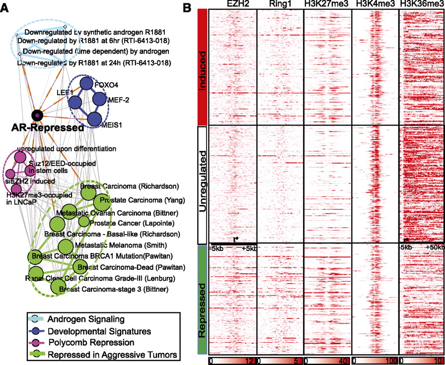 AR-repressed genes are developmental regulators involved in cell differentiation. (A) Network view of the molecular concepts enriched for AR-repressed genes (purple node with black ring). Each node represents a molecular concept or a gene set, with node size proportional to the number of genes within each concept. Each edge represents a statistically significant (P < 1 × 10−4) (Supplemental Table S3) overlap of genes in the two linked nodes. Enrichments with “androgen signaling” (light blue edges and nodes); enrichments with “developmental signatures” (dark blue); enrichments with “Polycomb repression signatures” (red); and enrichments with “repressed genes in aggressive tumors” (green). (B) ChIP-seq read density of regions surrounding the TSS (−5 to 50 kb for H3K36me3 and ±5 kb for others) of AR-induced or -repressed genes. ChIP-seq data in ES cells were obtained from GSE13084.