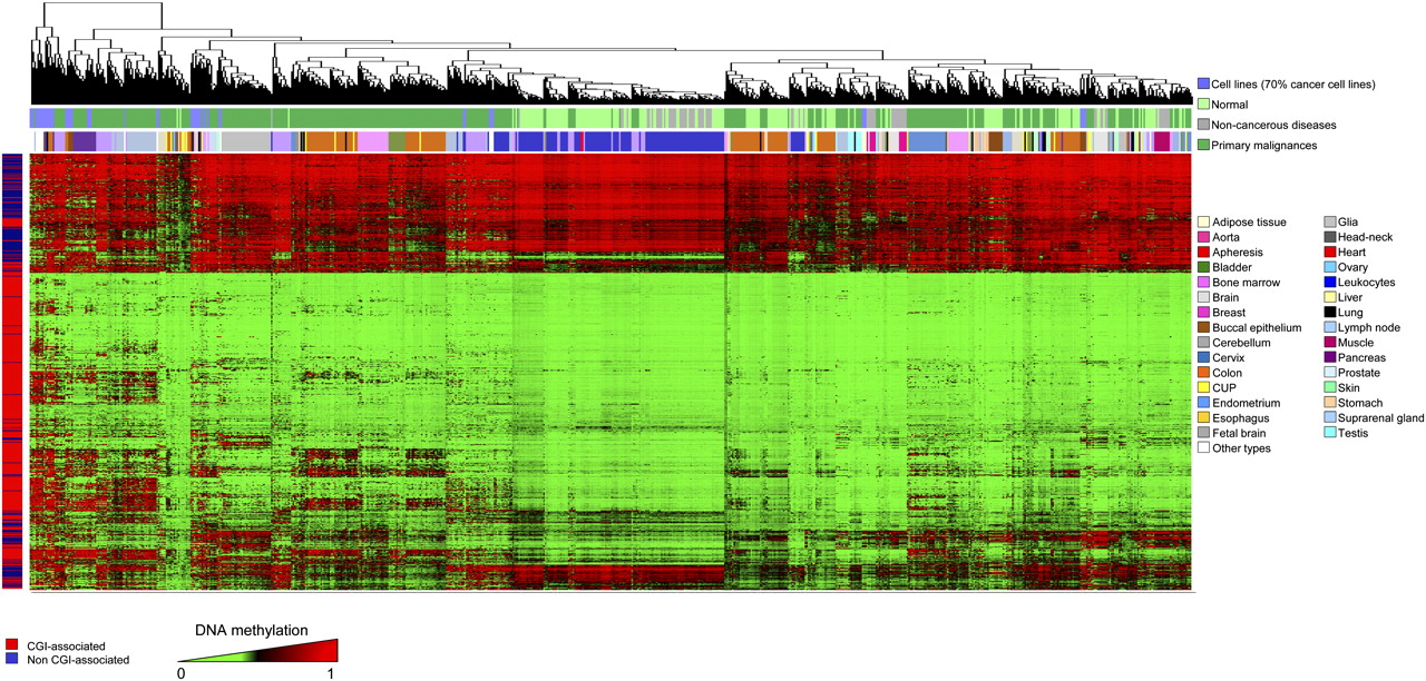 A DNA methylation fingerprint of 1628 human samples. Unsupervised hierarchical clustering and heatmap of all the CpG methylation maps obtained in the study, by tissue and disease type.