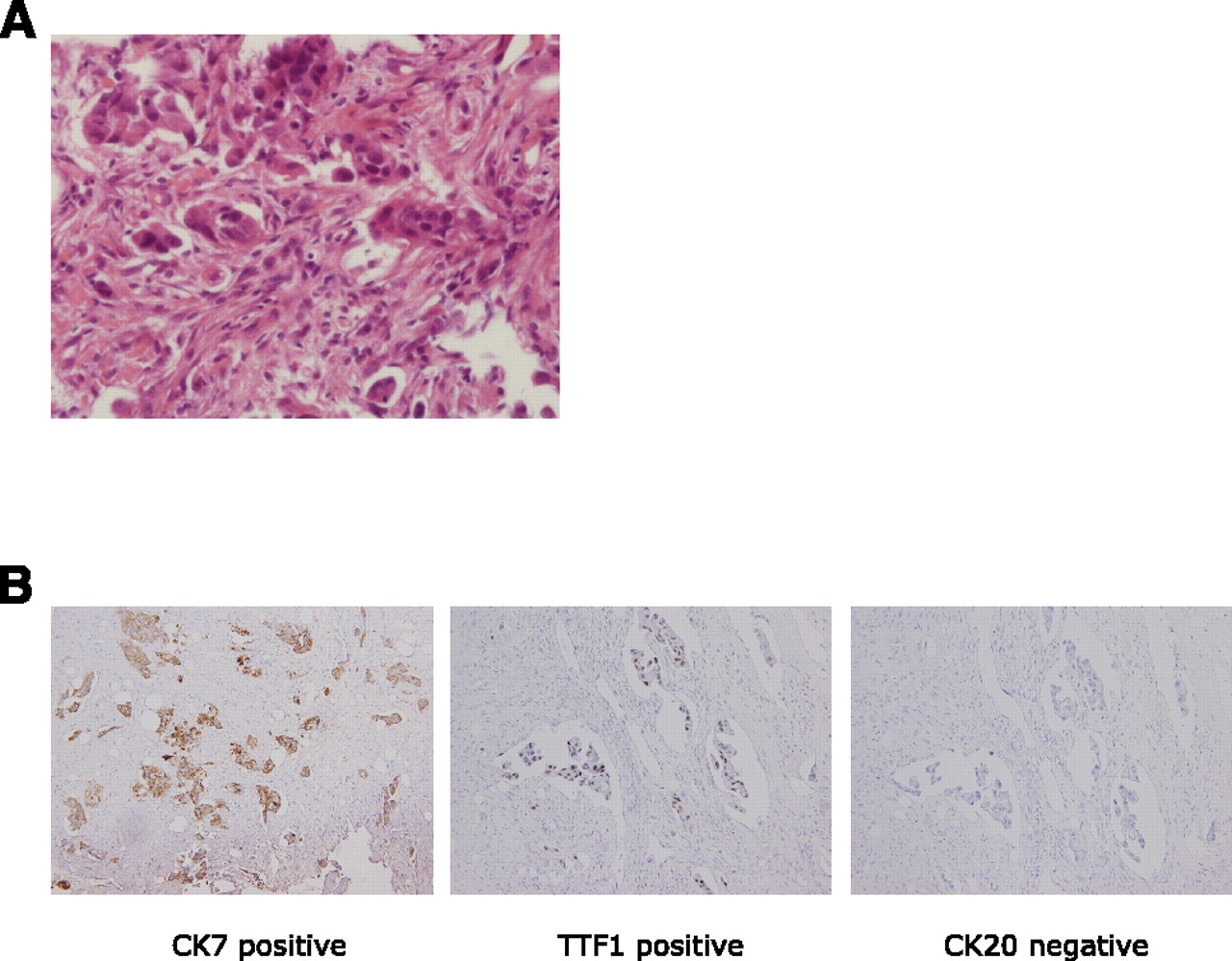 Pathology of lung adenocarcinoma analyzed in this study. (A) A paraffin section stained by hematoxylin and eosin from a primary lung cancer tissue obtained by CT-guided biopsy (400×). In the cancer tissue, poorly differentiated tumor cell nests were present in the desmoplastic stroma. In addition, the cancer cells had plump cytoplasm and large pleomorphic nuclei. (B) Immunohistochemical analyses of the cancer (from metastatic tumor in the cervical spine). From left to right, CK7 (positive), TTF1 (positive), and CK20 (negative). The results highly suggest that the origin of this cancer is lung adenocarcinoma.