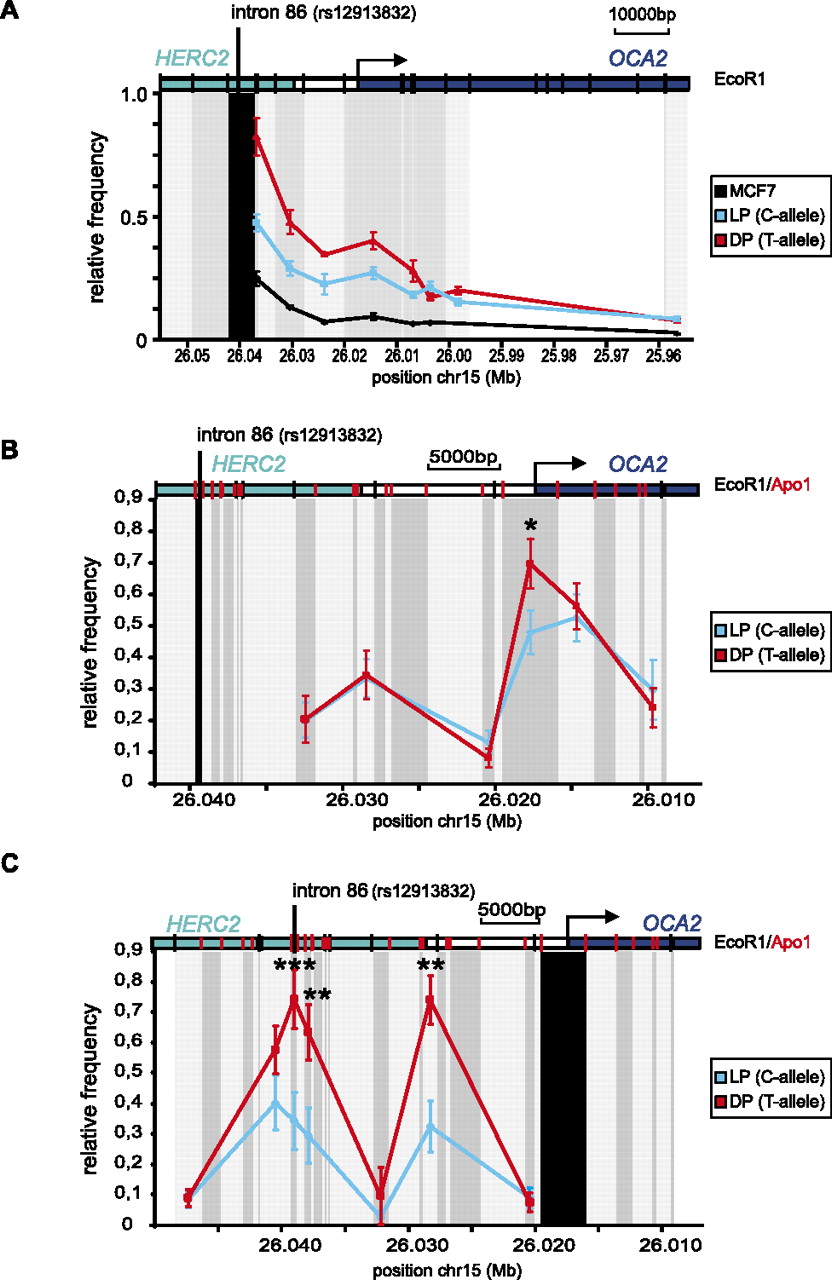 A chromatin loop is formed between the HERC2 rs12913832 enhancer region and the OCA2 promoter. (A–C) Locus-wide cross-linking frequencies observed in MCF7 (black), HEMn-LP (cyan), and HEMn-DP (red) cells. The analyzed region of the human OCA2-HERC2 locus is depicted on the top of each graph. The x-axis shows the approximate position on chromosome 15 (UCSC Browser NCBI36/hg18 assembly; see also Fig. 1A). (Black shading) The position and size of the “fixed” restriction fragment; (gray shading) position and size of other restriction fragments analyzed. (Black vertical bars in the locus graph) EcoRI sites; (red vertical bars) ApoI sites. The cross-linking frequencies are normalized to the highest interaction within an experiment. (A) Cross-linking frequencies for an EcoRI restriction fragment containing rs12913832 in MCF7 and HEMn cells. In HEMn cells, high cross-linking frequencies are observed for a restriction fragment containing the OCA2 promoter. (B) Cross-linking frequencies for an ApoI restriction fragment containing rs12913832 in HEMn cells. In HEMn cells, high cross-linking frequencies are observed for a restriction fragment containing the OCA2 promoter. Cross-linking frequencies between the restriction fragment containing rs12913832 and the restriction fragment containing the OCA2 promoter are higher for the T-allele (red) than for the C-allele (cyan). (C) Cross-linking frequencies for an ApoI restriction fragment containing the OCA2 promoter in HEMn cells. High cross-linking frequencies with restriction fragments surrounding the rs12913832 enhancer region are observed in HEMn cells. Cross-linking frequencies between the restriction fragment containing rs12913832 and the restriction fragment containing the OCA2 promoter are higher for the T-allele (red) than for the C-allele (cyan). Data are represented as mean ± SEM; (*) p < 0.05; (**) p < 0.01; (***) p < 0.005.