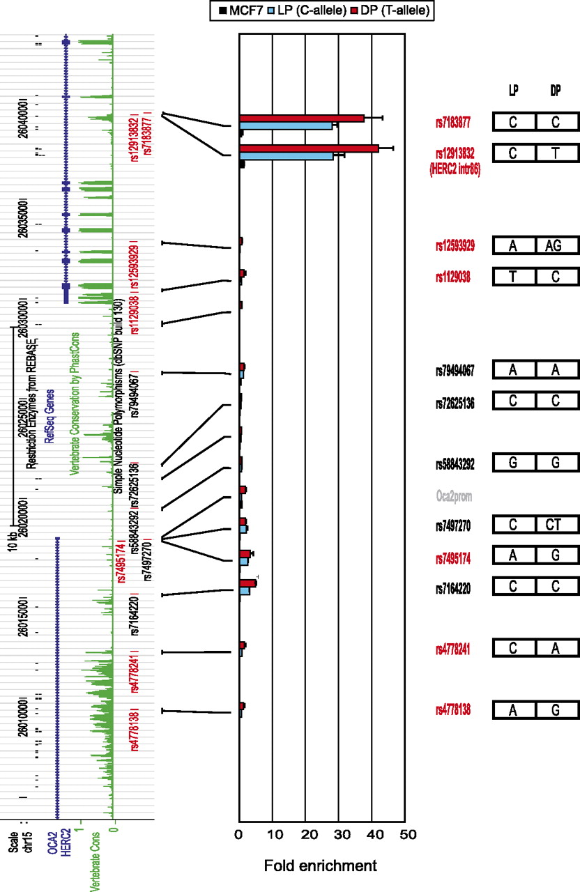 FAIRE analysis of pigmentation-associated SNPs other than HERC2 rs12913832 present within the 3′HERC2/5′OCA2 region does not reveal additional regulatory elements. (Left side) Tracks from the UCSC Browser (NCBI36/hg18 assembly; http://genome.ucsc.edu/cgi-bin/hgGateway?db=hg18) of the investigated 3′HERC2/5′OCA2 region. Pigmentation-associated SNPs (red); linked SNPs (r2 > 0.8) (black). The approximate location of the analyzed PCR amplicons is indicated. (Right side) The genotype of each SNP for HEMn-LP and HEMn-DP. The enrichments displayed are relative to NDN. Data are represented as mean ± SEM.
