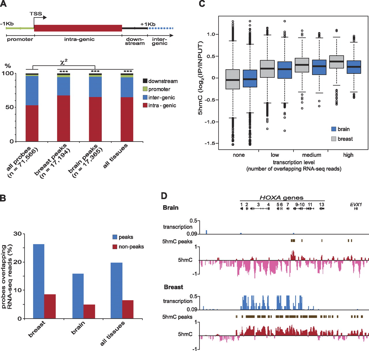 5hmC is enriched in transcribed regions. (A) Diagram illustrating the defined genomic regions that are assayed for %5hmC enrichment. All probes found within peaks of 5hmC enrichment were classified according to their genic location. The bar chart below illustrates that probes within peaks of 5hmC (“peak-probes”) are enriched in intragenic regions in brain and breast tissues. See text for definition of 5hmC peaks. (B) Bar chart illustrating that the peak-probes associate with regions of active transcription in brain and breast. The percentage of probes overlapping RNA-sequencing reads for each tissue is shown. (C) Box plot showing that 5hmC levels increase with steady-state transcript levels. Each probe was classified according to its number of overlapping RNA-sequencing reads for brain and breast; none = 0, low = 1, medium = 1–5, high > 5. (D) The presence of 5hmC is associated with transcription. The HOXA cluster is transcribed and marked with 5hmC in breast, whereas transcription and 5hmC appear absent in brain. Schematic representation of both the 5hmC and RNA-sequencing profile of the HOXA cluster is shown; the figure is adapted from the UCSC Genome Browser. Transcription values are given in reads per million (RPM).