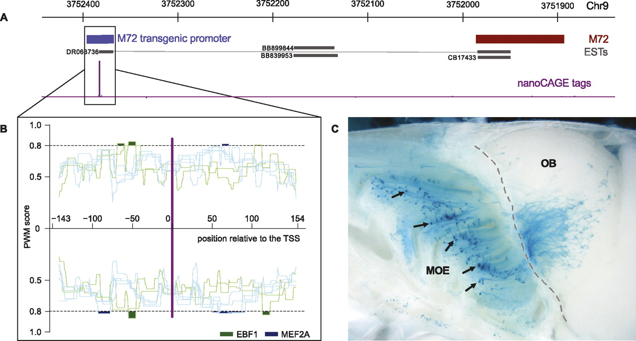 Transgenic reporter assay of the promoter activity of sequences flanking a nanoCAGE TSS. (A) Schematic depiction of the locus of Olfr160 (M72) on mouse chromosome 9. (Red) OLFR160 coding sequence; (blue) Olfr160 transgenic promoter; (purple) nanoCAGE tags; (black) ESTs. (B) Position weight matrix (PWM) scanning of the promoter sequences with matrices for EBF1 (green) and MEF2A (blue). Highlighted are the regions where the signal is above a 0.8 score threshold. (C) Whole mount of a mouse from transgenic line 7 shows X-gal-labeled cells predominantly in the middle domain of the MOE (black arrows). Labeled axons spread over a large domain in the middle aspect of the medial half-olfactory bulb, a probable consequence of the absence of an intact OR CDS in the transgene. The dotted gray line follows the shape of the cribiform plate separating the MOE from the olfactory bulb (OB).