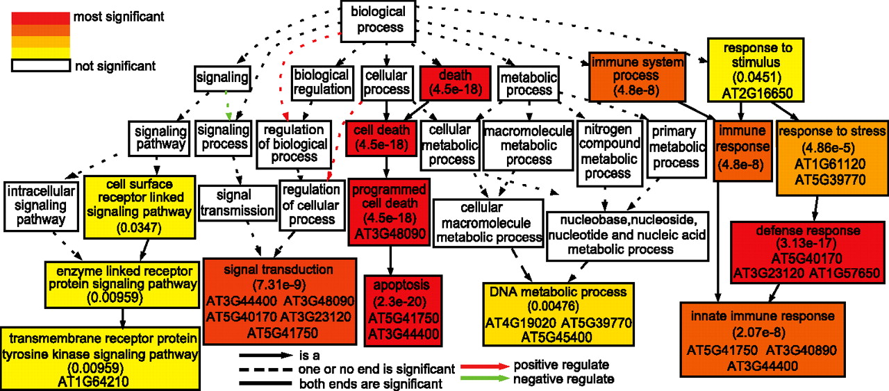 Gene Ontology groups enriched among genes with 10 or more nonsynonymous SNPs. Statistical significance is color coded, with Yekutieli FDR adjusted P-value shown in each significant group. Most enriched GO groups contain some genes with large dN/dS values (≥1.6), as shown by TAIR gene IDs in the box.