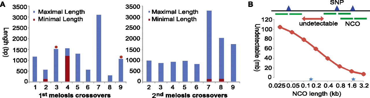 Properties of COs and NCOs in Arabidopsis. (A) The minimal (red) and maximal (blue) lengths of detected CO-associated conversion tracts from the first meiosis (left) and the second meiosis (right). The maximal length is the distance between two closest SNPs in unchanged regions flanking CO. The minimal length refers to the region having multiple 3:1 converted SNPs (one of the chromatids having a converted allele). In either the first or the second meiosis, there are two COs containing multiple converted SNPs, with maximal lengths ranging from ∼500 to ∼3000 bp. The red asterisks at the top of two bars indicate that the corresponding COs each had a 1-bp GC. In the second meiosis, CO-1 is not displayed here because it occurred in a large region without SNPs, making the position of CO-1 uncertain. (B) Predicted cumulative length of uncovered regions changes with possible length of NCO. NCO can only be detected if it covers at least one SNP, but is invisible between two adjacent SNPs. The predicted cumulative length of uncovered regions increases significantly when the length of NCO diminishes. Two blue stars show previously reported median NCO tract length from yeast (1.8 Kb) and human (156 bp).
