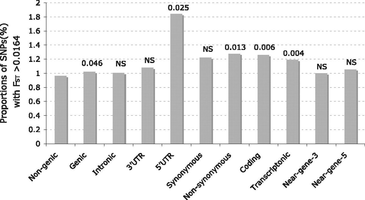 Enrichment of high FST loci for different SNP categories. Observed excess of high FST loci in different SNP classes, with respect to nongenic class, in the high FST bin (99th percentile; FST > 0.0164). The values on the bar are P-values of χ2 tests. NS, not significant.