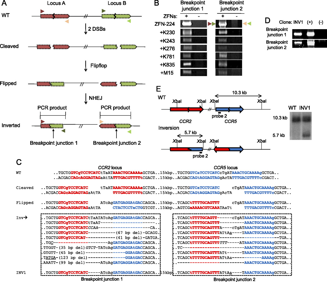Inversions induced by ZFNs. (A) Schematic representation of ZFN-mediated inversions. Zigzag lines indicate ZFN target sites. PCR primers (triangles) used for the detection of two breakpoint junctions that result from genomic inversions are shown. (B) PCR products corresponding to inversion events in cells treated with various combinations of two ZFN pairs. (C) DNA sequences of breakpoint junctions of the inversion events. Nucleotide sequences of CCR5 and CCR2 sites are shown in blue and red, respectively. (Inv) Various inversion junctions induced by ZFN-224. Inversion junction sequences induced by other ZFNs are shown in Supplemental Figure 4. The two breakpoint junction sequences in the INV1 clone are also shown. Nonconserved bases at the CCR2 and CCR5 loci are shown in lowercase letters. Symbols are as in Figure 1. (D) PCR products validating inversions in the INV1 clone. (+) and (−) are as in Figure 2D. (E) Schematic of CCR2 and CCR5 loci in the wild-type and inversion alleles and Southern blot analysis. Symbols are as in Figure 1.